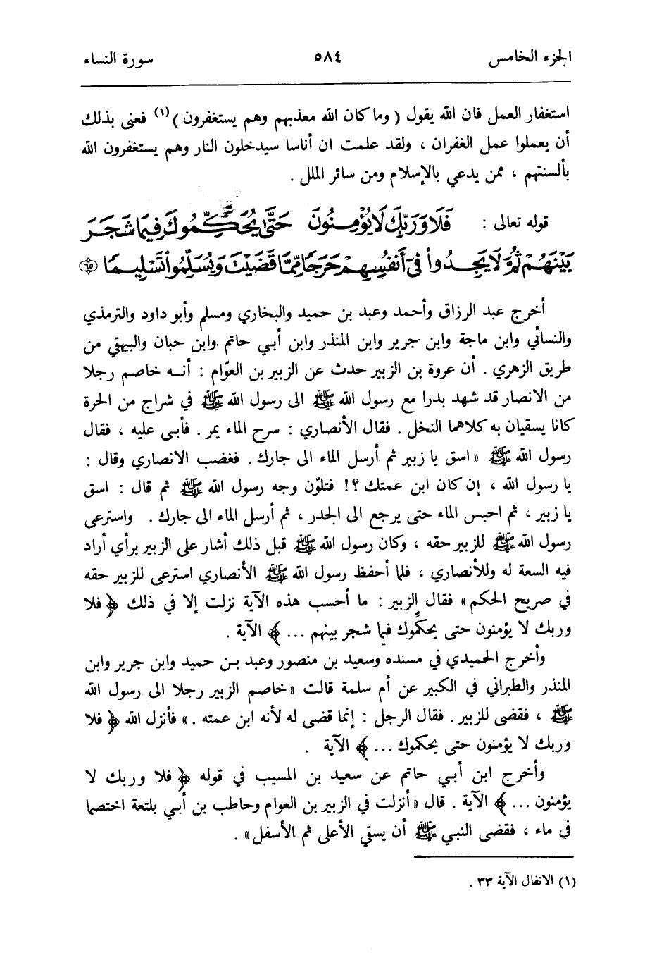 واسترعى رَسُول الله صلى الله عَلَيْهِ وَسلم للزبير حَقه وَكَانَ رَسُول الله صلى الله عَلَيْهِ وَسلم قبل ذَلِك أَشَارَ على الزبير بِرَأْي أَرَادَ فِيهِ السعَة لَهُ وللأنصاري فَلَمَّا أحفظ رَسُول الله صلى الله عَلَيْهِ وَسلم الْأنْصَارِيّ استرعى للزبير حَقه فِي صَرِيح الحكم فَقَالَ الزبير: مَا أَحسب هَذِه الْآيَة نزلت إِلَّا فِي ذَلِك {فَلَا وَرَبك لَا يُؤمنُونَ حَتَّى يحكِّموك فِيمَا شجر بَينهم} الْآيَة