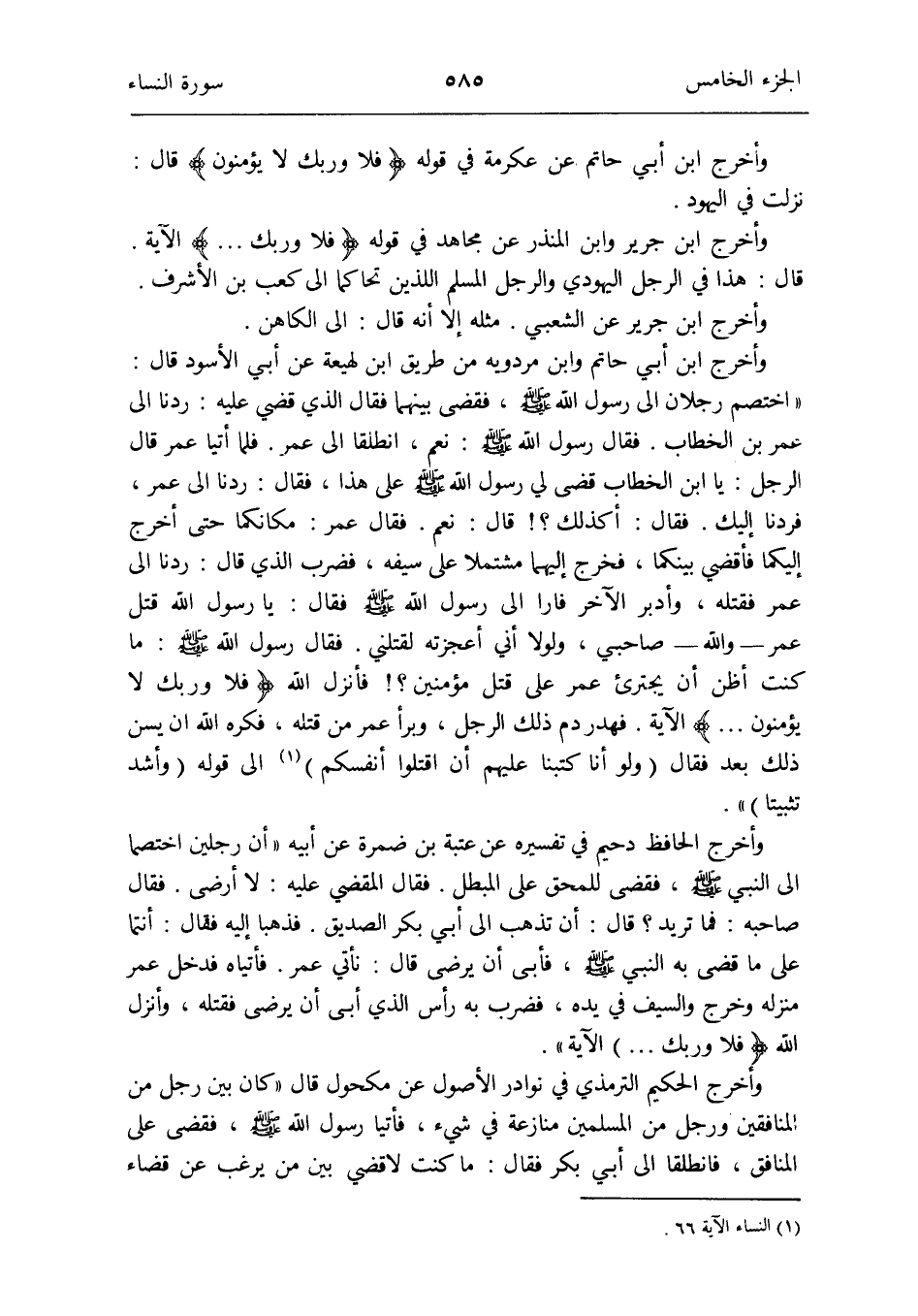 وَأخرج ابْن أبي حَاتِم عَن عِكْرِمَة فِي قَوْله {فَلَا وَرَبك لَا يُؤمنُونَ} قَالَ: نزلت فِي الْيَهُود