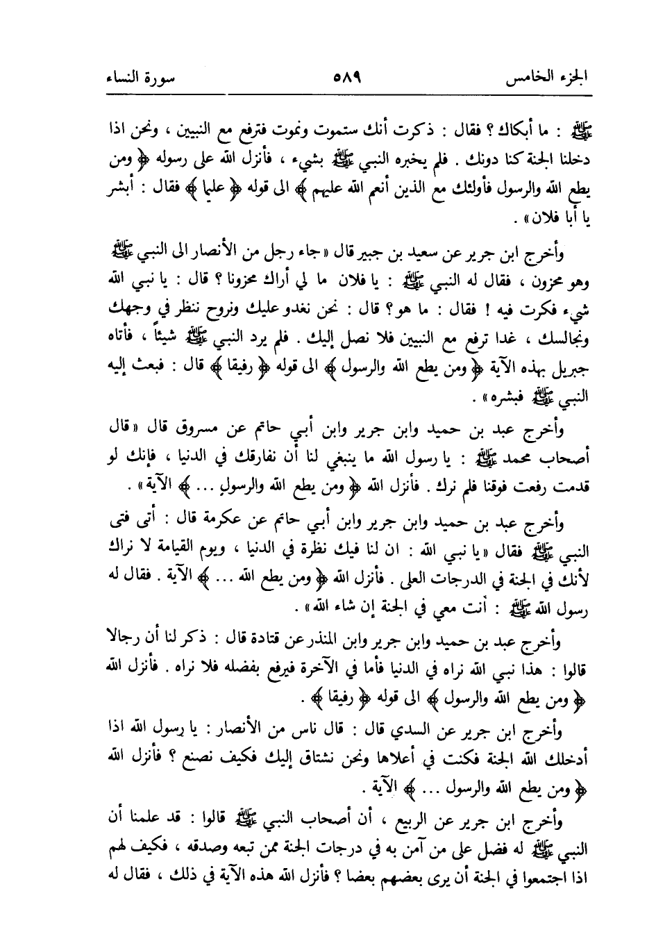 وَأخرج ابْن جرير عَن سعيد بن جُبَير قَالَ: جَاءَ رجل من الْأَنْصَار إِلَى النَّبِي صلى الله عَلَيْهِ وَسلم وَهُوَ محزون فَقَالَ لَهُ النَّبِي صلى الله عَلَيْهِ وَسلم: يَا فلَان مَا لي أَرَاك مَحْزُونا قَالَ: يَا نَبِي الله شَيْء فَكرت فِيهِ فَقَالَ: مَا هُوَ قَالَ: نَحن نغدو عَلَيْك وَنَرُوح نَنْظُر فِي وَجهك وَنُجَالِسك غَدا ترفع مَعَ النَّبِيين فَلَا نصل إِلَيْك