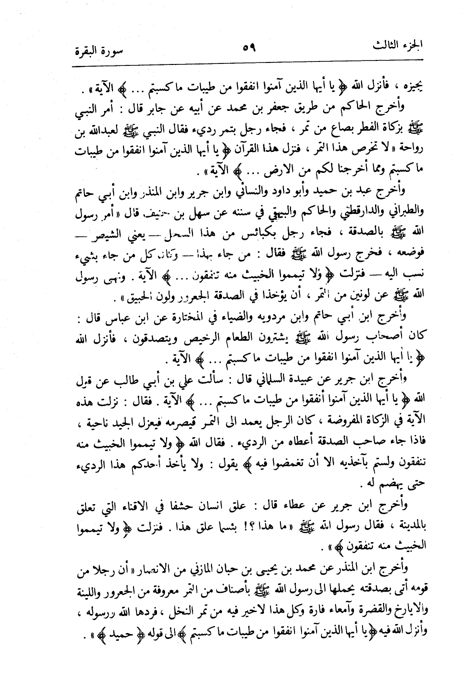 وَأخرج الْحَاكِم من طَرِيق جَعْفَر بن مُحَمَّد عَن أَبِيه عَن جَابر قَالَ: أَمر النَّبِي صلى الله عَلَيْهِ وَسلم بِزَكَاة الْفطر بِصَاع من تمر فجَاء رجل بِتَمْر رَدِيء فَقَالَ النَّبِي صلى الله عَلَيْهِ وَسلم لعبد الله بن رَوَاحَة لَا تخرص هَذَا التَّمْر فَنزل هَذَا الْقُرْآن {يَا أَيهَا الَّذين آمنُوا أَنْفقُوا من طَيّبَات مَا كسبتم وَمِمَّا أخرجنَا لكم من الأَرْض} الْآيَة