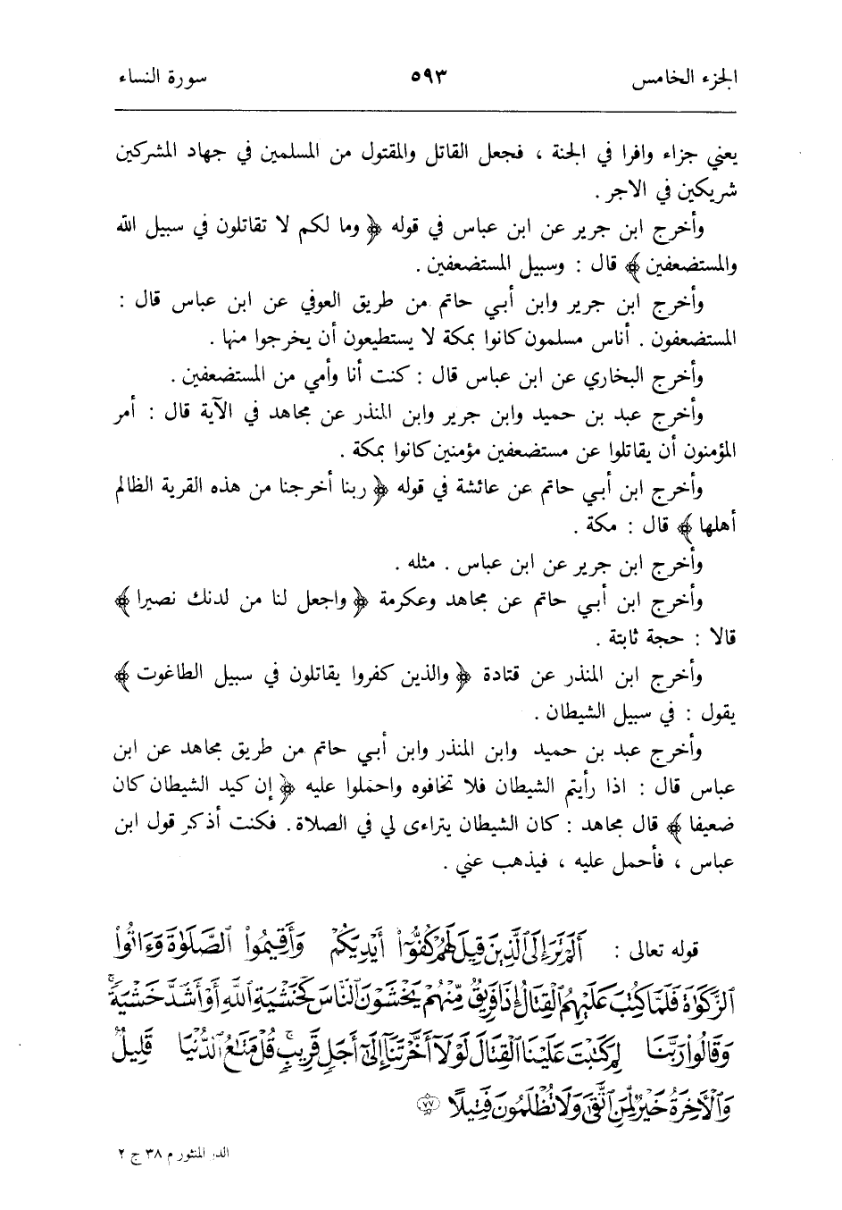 وَأخرج ابْن جرير عَن ابْن عَبَّاس فِي قَوْله {وَمَا لكم لَا تقاتلون فِي سَبِيل الله وَالْمُسْتَضْعَفِينَ} قَالَ: وسبيل الْمُسْتَضْعَفِينَ