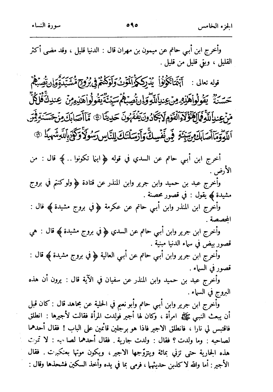 وَأخرج عبد بن حميد وَابْن جرير وَابْن الْمُنْذر عَن قَتَادَة {وَلَو كُنْتُم فِي بروج مشيدة} يَقُول فِي قُصُور مُحصنَة