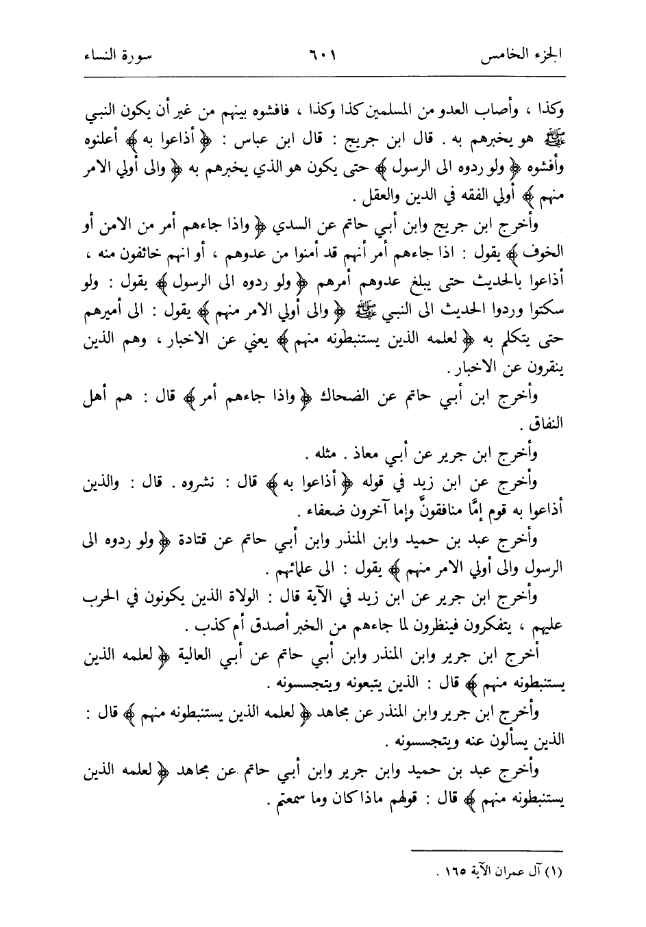 وَأخرج ابْن جريج وَابْن أبي حَاتِم عَن السّديّ {وَإِذا جَاءَهُم أَمر من الْأَمْن أَو الْخَوْف} يَقُول: إِذا جَاءَهُم أَمر أَنهم قد أمنُوا من عدوهم أَو أَنهم خائفون مِنْهُ أذاعوا بِالْحَدِيثِ حَتَّى يبلغ عدوهم أَمرهم {وَلَو ردُّوهُ إِلَى الرَّسُول} يَقُول: وَلَو سكتوا وردوا الحَدِيث إِلَى النَّبِي صلى الله عَلَيْهِ وَسلم {وَإِلَى أولي الْأَمر مِنْهُم} يَقُول: إِلَى أَمِيرهمْ حَتَّى يتَكَلَّم بِهِ {لعلمه الَّذين يستنبطونه مِنْهُم} يَعْنِي عَن الْأَخْبَار وهم الَّذين ينقرون عَن الْأَخْبَار