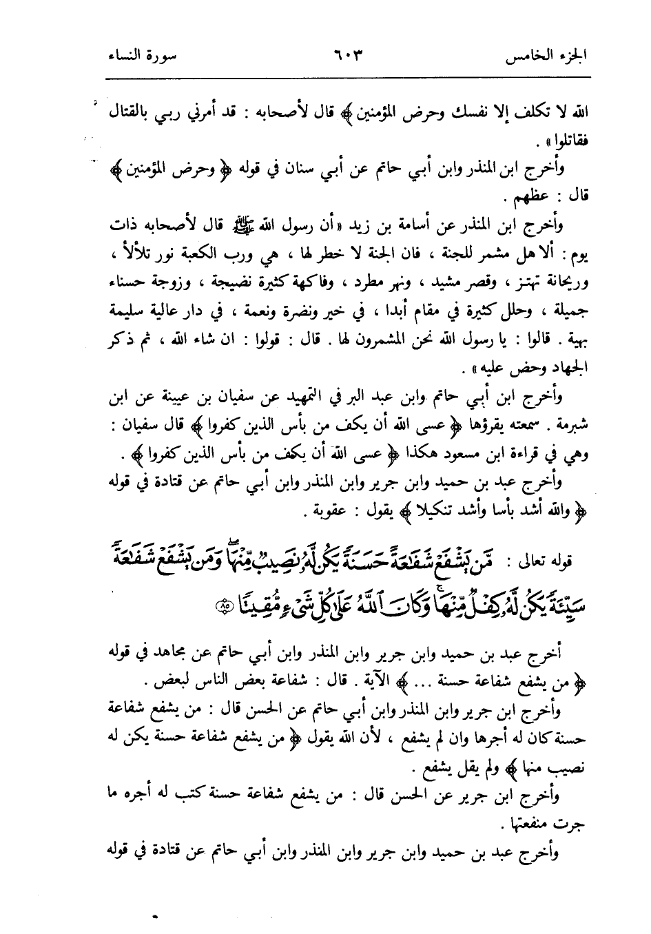 أخرج عبد بن حميد وَابْن جرير وَابْن الْمُنْذر وَابْن أبي حَاتِم عَن مُجَاهِد فِي قَوْله {من يشفع شَفَاعَة حَسَنَة} الْآيَة
