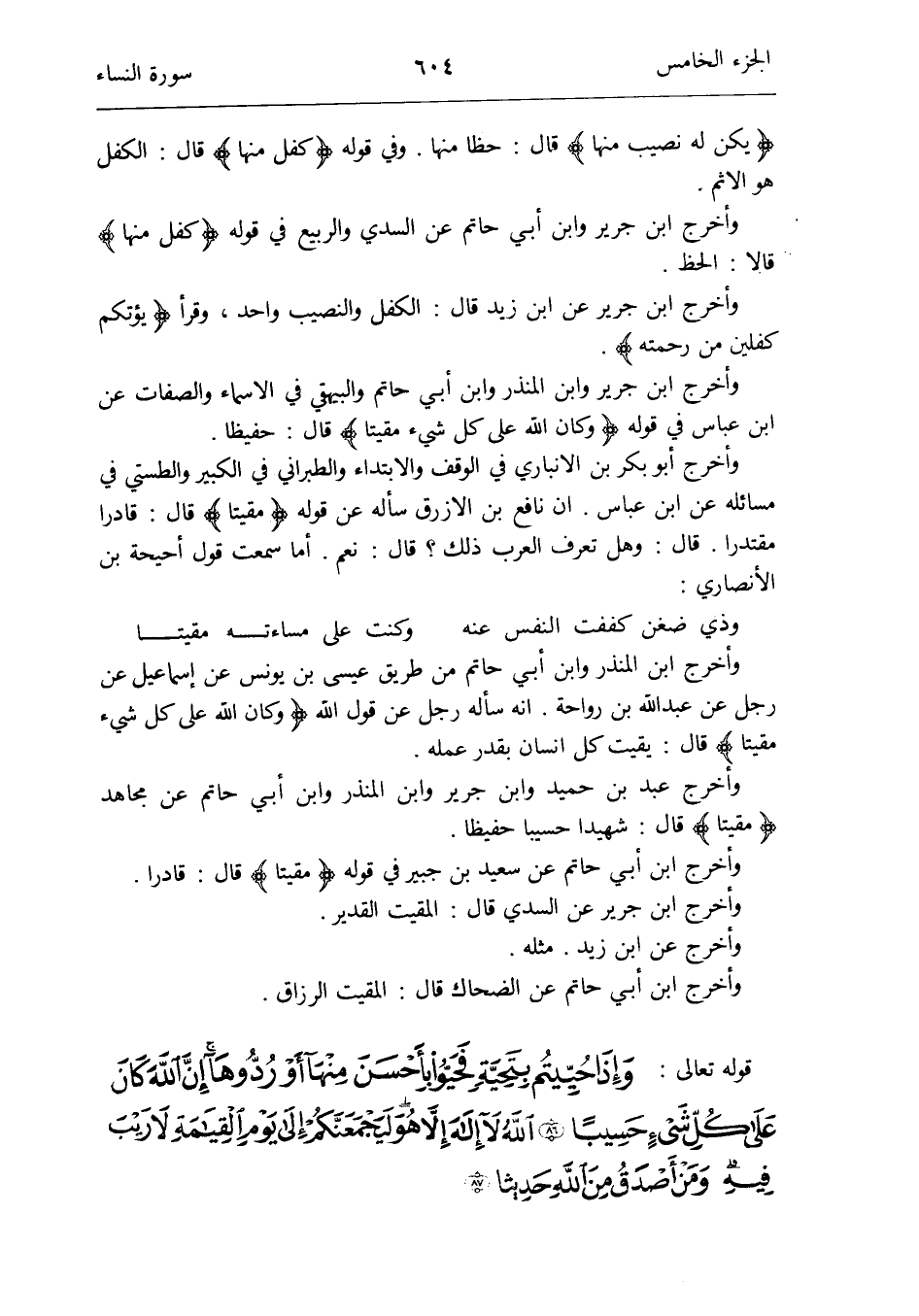 وَأخرج ابْن جرير وَابْن الْمُنْذر وَابْن أبي حَاتِم وَالْبَيْهَقِيّ فِي الْأَسْمَاء وَالصِّفَات عَن ابْن عَبَّاس فِي قَوْله {وَكَانَ الله على كل شَيْء مقيتاً} قَالَ: حفيظاً
