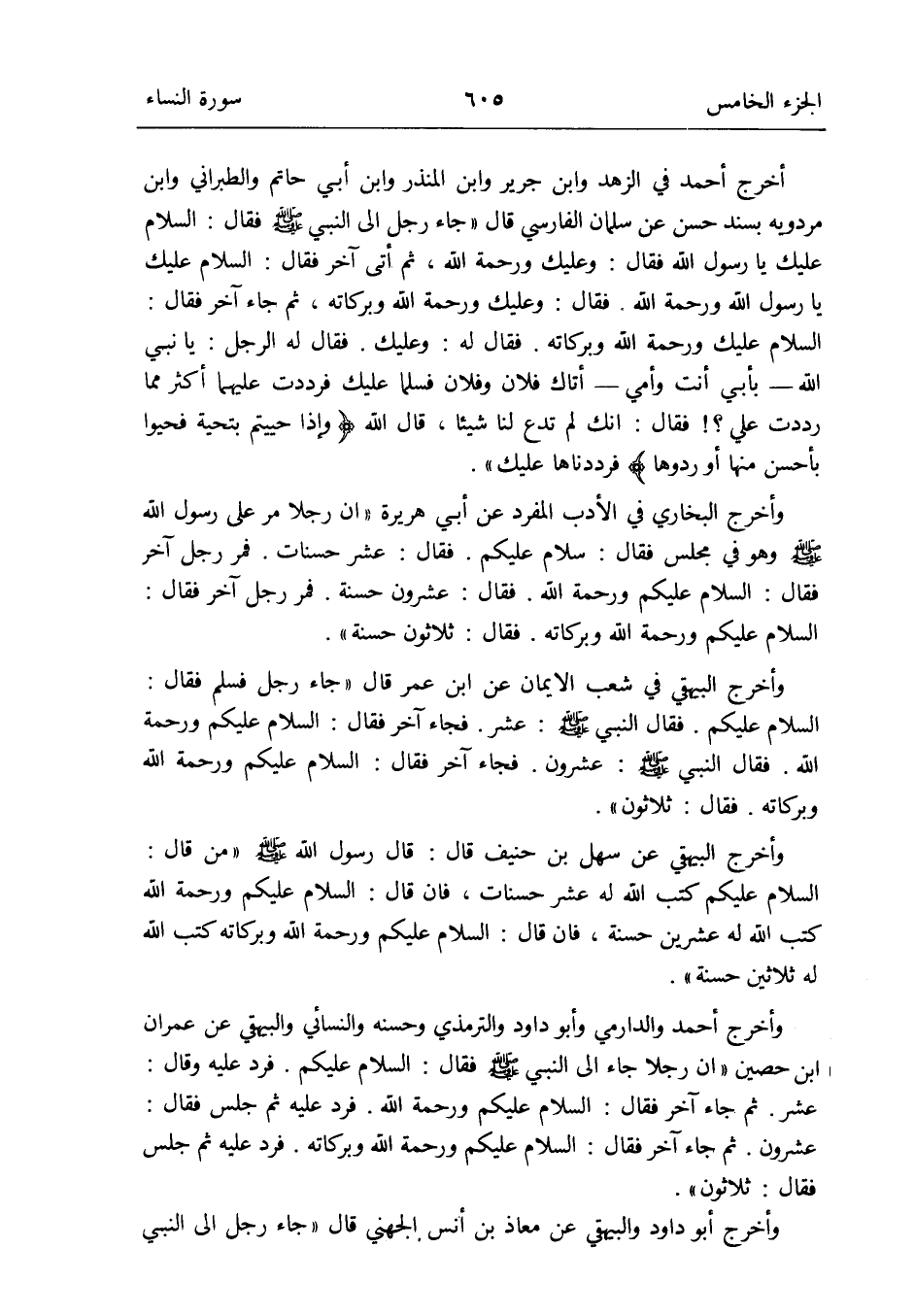 أخرج أَحْمد فِي الزّهْد وَابْن جرير وَابْن الْمُنْذر وَابْن أبي حَاتِم وَالطَّبَرَانِيّ وَابْن مرْدَوَيْه بِسَنَد حسن عَن سلمَان الْفَارِسِي قَالَ: جَاءَ رجل إِلَى النَّبِي صلى الله عَلَيْهِ وَسلم فَقَالَ: السَّلَام عَلَيْك يَا رَسُول الله فَقَالَ: وَعَلَيْك وَرَحْمَة الله ثمَّ أَتَى آخر فَقَالَ: السَّلَام عَلَيْك يَا رَسُول الله وَرَحْمَة الله