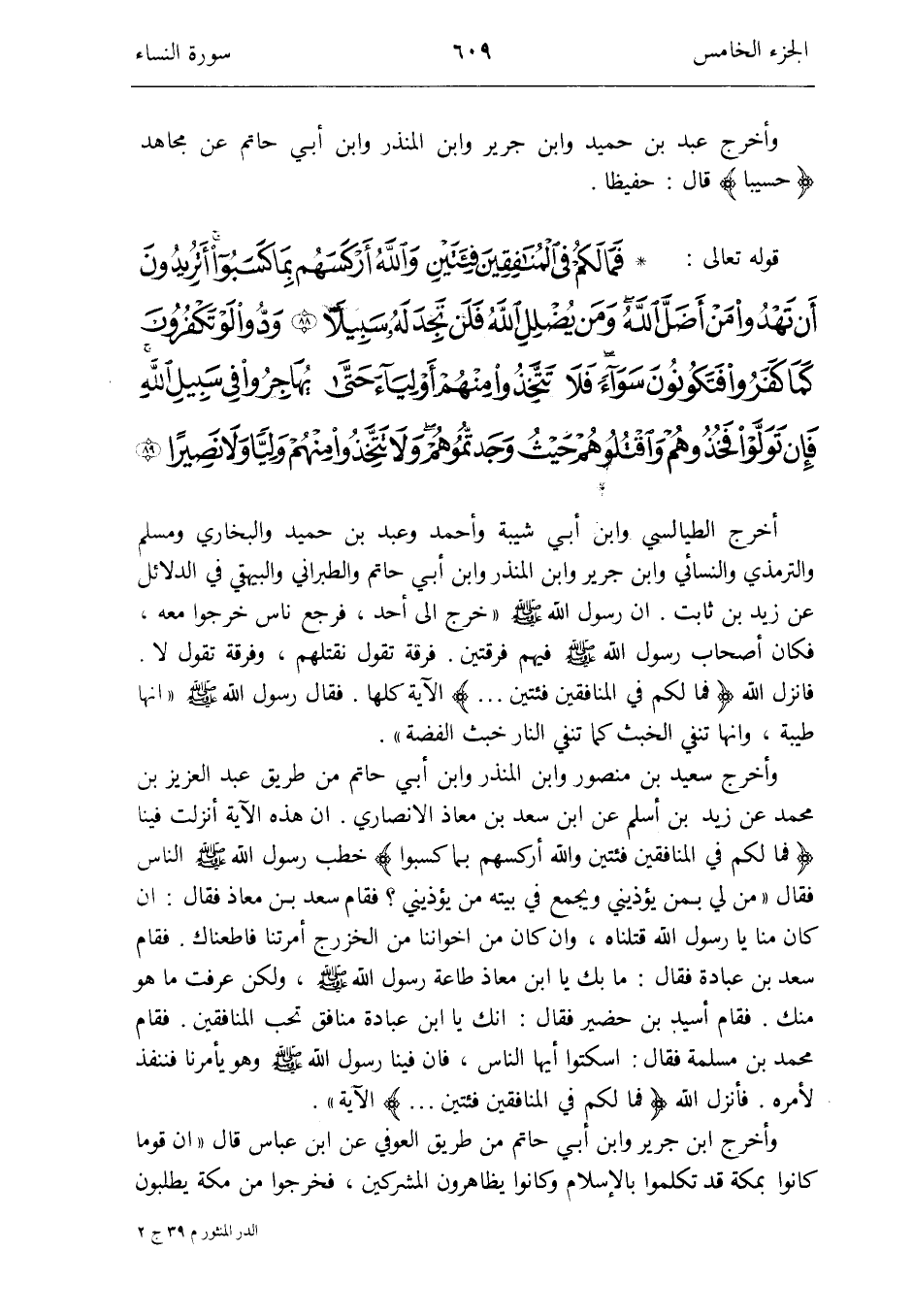 أخرج الطَّيَالِسِيّ وَابْن أبي شيبَة وَأحمد وَعبد بن حميد وَالْبُخَارِيّ وَمُسلم وَالتِّرْمِذِيّ وَالنَّسَائِيّ وَابْن جرير وَابْن الْمُنْذر وَابْن أبي حَاتِم وَالطَّبَرَانِيّ وَالْبَيْهَقِيّ فِي الدَّلَائِل عَن زيد بن ثَابت أَن رَسُول الله صلى الله عَلَيْهِ وَسلم خرج إِلَى أحد فَرجع نَاس خَرجُوا مَعَه فَكَانَ أَصْحَاب رَسُول الله صلى الله عَلَيْهِ وَسلم فيهم فرْقَتَيْن: فرقة تَقول: نقتلهم