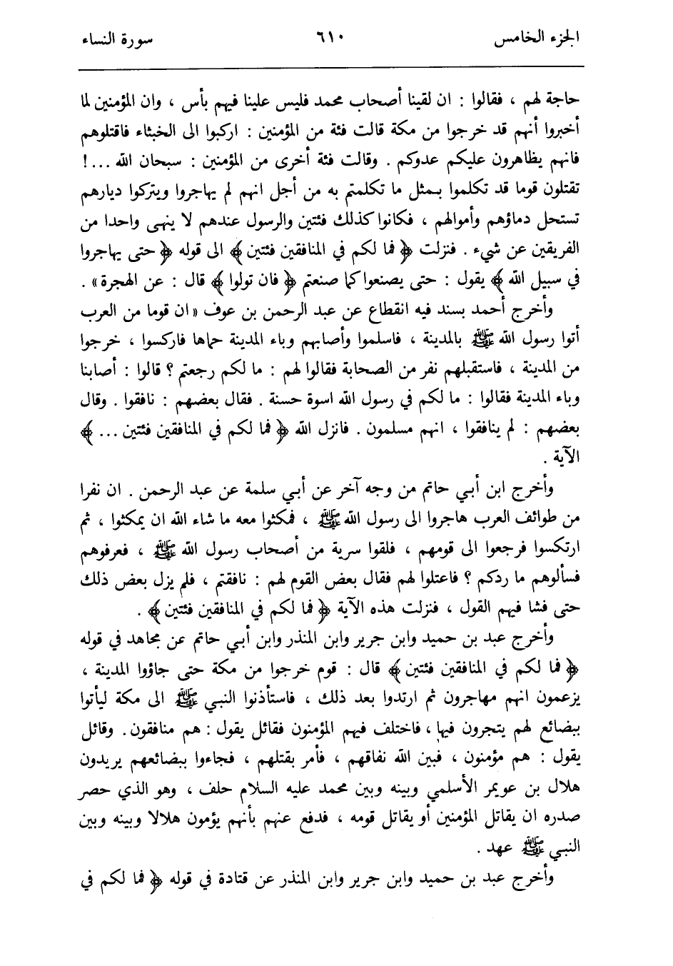 وَأخرج ابْن أبي حَاتِم من وَجه آخر عَن أبي سَلمَة عَن عبد الرَّحْمَن أَن نَفرا من طوائف الْعَرَب هَاجرُوا إِلَى رَسُول الله صلى الله عَلَيْهِ وَسلم فَمَكَثُوا مَعَه مَا شَاءَ الله أَن يمكثوا ثمَّ ارتكسوا فَرَجَعُوا إِلَى قَومهمْ فَلَقوا سَرِيَّة من أَصْحَاب رَسُول الله صلى الله عَلَيْهِ وَسلم فعرفوهم فَسَأَلُوهُمْ: مَا ردكم فَاعْتَلُّوا لَهُم فَقَالَ بعض الْقَوْم لَهُم: نافقتم فَلم يزل بعض ذَلِك حَتَّى فَشَا فيهم القَوْل فَنزلت هَذِه الْآيَة {فَمَا لكم فِي الْمُنَافِقين فئتين}