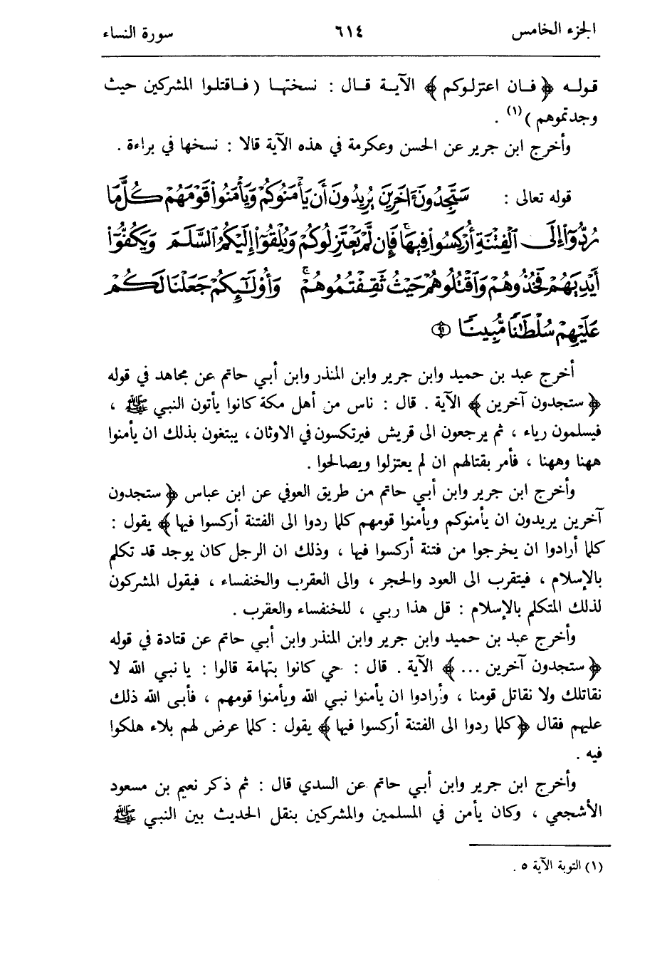 قَالَ: نسختها (فَاقْتُلُوا الْمُشْركين حَيْثُ وَجَدْتُمُوهُمْ) (التَّوْبَة الْآيَة 5)