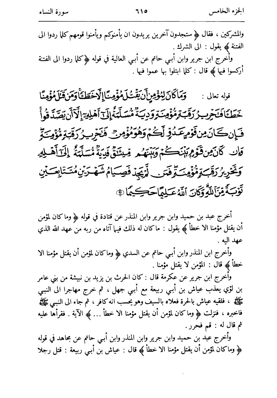 وَأخرج عبد بن حميد وَابْن جرير وَابْن الْمُنْذر وَابْن أبي حَاتِم عَن مُجَاهِد فِي قَوْله {وَمَا كَانَ لمُؤْمِن أَن يقتل مُؤمنا إِلَّا خطأ} قَالَ: عَيَّاش بن أبي ربيعَة: قتل رجلا