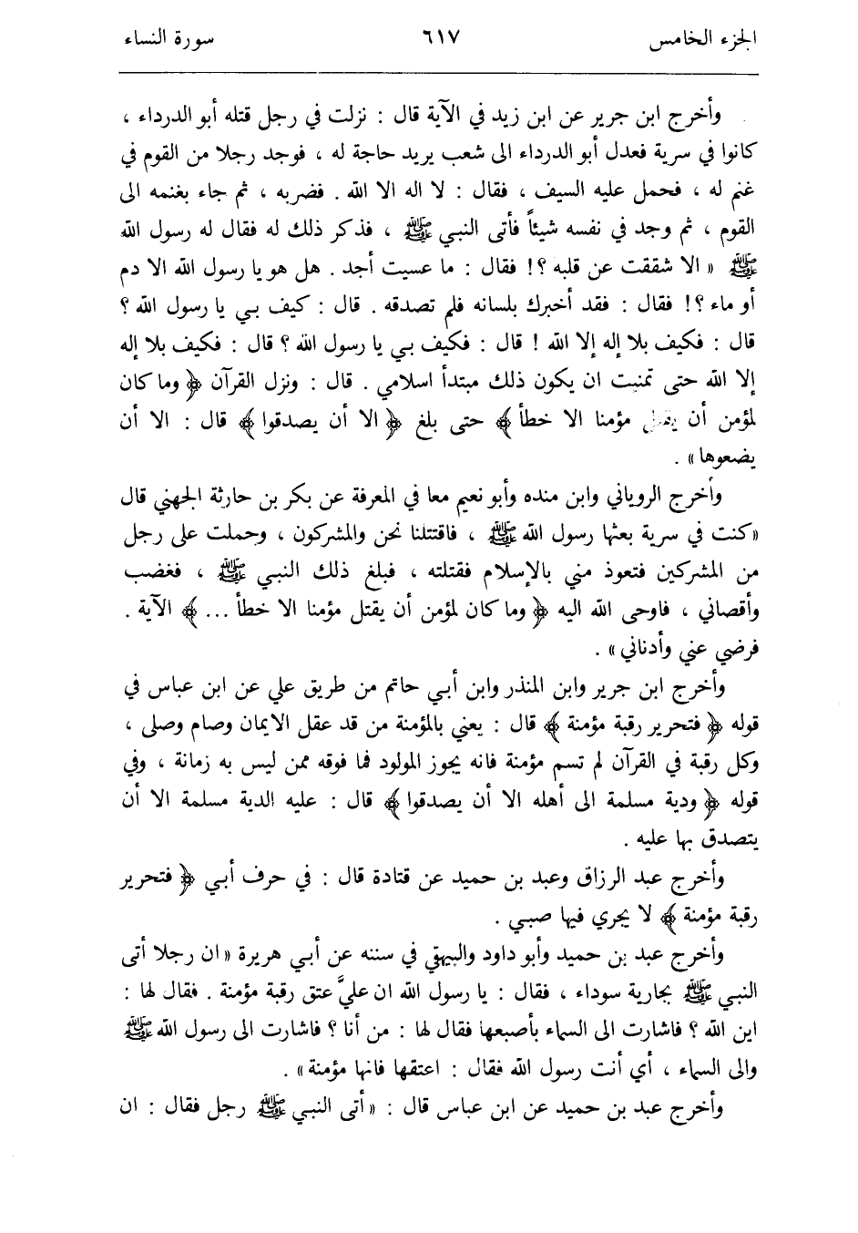وَأخرج ابْن جرير وَابْن الْمُنْذر وَابْن أبي حَاتِم من طَرِيق عَليّ عَن ابْن عَبَّاس فِي قَوْله {فَتَحْرِير رَقَبَة مُؤمنَة} قَالَ: يَعْنِي بالمؤمنة من قد عقل الْإِيمَان وَصَامَ وَصلى وكل رَقَبَة فِي الْقُرْآن لم تسم مُؤمنَة فَإِنَّهُ يجوز الْمَوْلُود فَمَا فَوْقه مِمَّن لَيْسَ بِهِ زمانة وَفِي قَوْله {ودية مسلمة إِلَى أَهله إِلَّا أَن يصدقُوا} قَالَ: عَلَيْهِ الدِّيَة مسلمة إِلَّا أَن يتَصَدَّق بهَا عَلَيْهِ