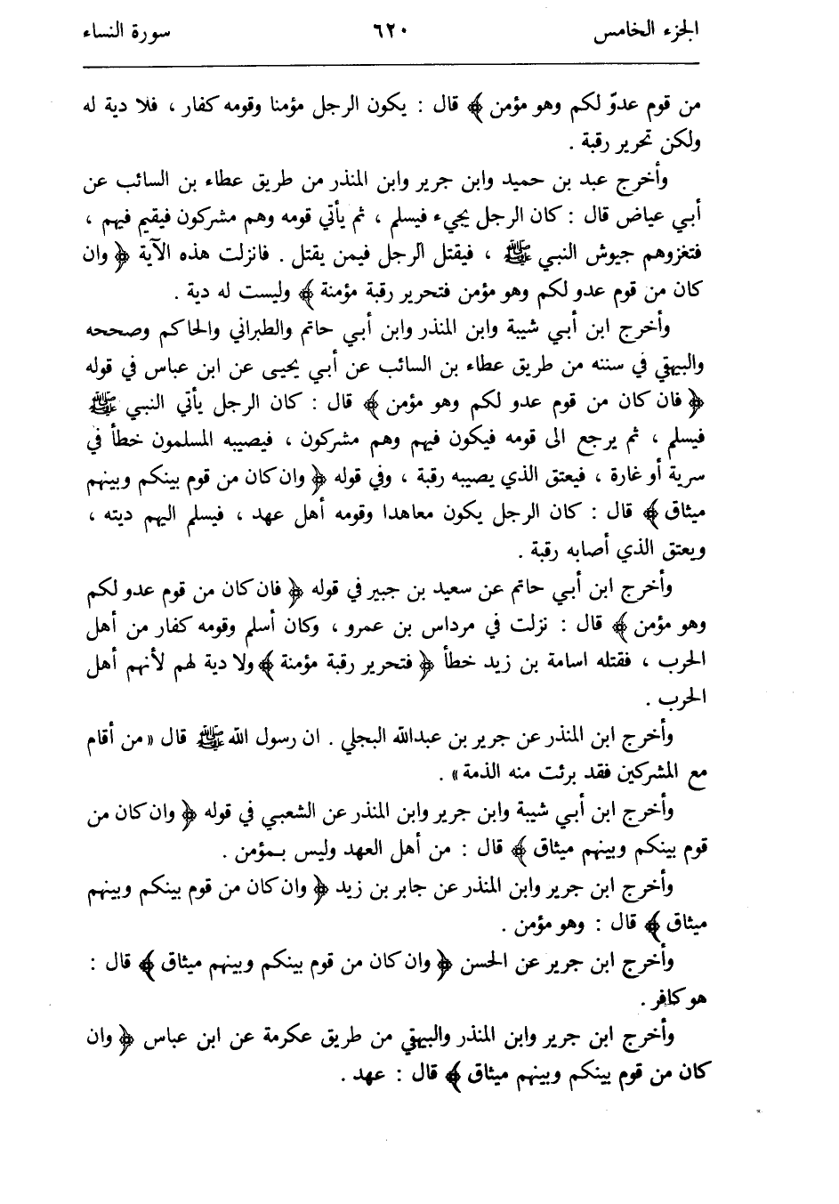 وَأخرج ابْن أبي شيبَة وَابْن الْمُنْذر وَابْن أبي حَاتِم وَالطَّبَرَانِيّ وَالْحَاكِم وَصَححهُ وَالْبَيْهَقِيّ فِي سنَنه من طَرِيق عَطاء بن السَّائِب عَن أبي يحيى عَن ابْن عَبَّاس فِي قَوْله {فَإِن كَانَ من قوم عَدو لكم وَهُوَ مُؤمن} قَالَ: كَانَ الرجل يَأْتِي النَّبِي صلى الله عَلَيْهِ وَسلم فَيسلم ثمَّ يرجع إِلَى قومه فَيكون فيهم وهم مشركون فَيُصِيبهُ الْمُسلمُونَ خطأ فِي سَرِيَّة أَو غَارة فَيعتق الَّذِي يُصِيبهُ رَقَبَة وَفِي قَوْله {وَإِن كَانَ من قوم بَيْنكُم وَبينهمْ مِيثَاق} قَالَ: كَانَ الرجل يكون معاهداً وَقَومه أهل عهد فَيسلم إِلَيْهِم دِيَته وَيعتق الَّذِي أَصَابَهُ رَقَبَة