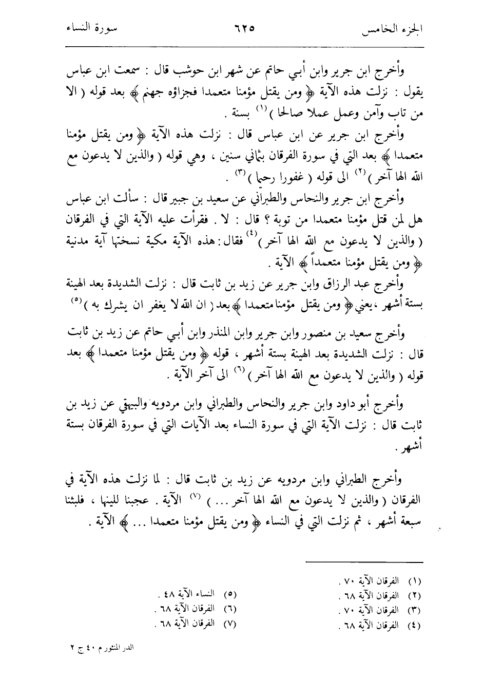 وَأخرج ابْن جرير عَن ابْن عَبَّاس قَالَ: نزلت هَذِه الْآيَة {وَمن يقتل مُؤمنا مُتَعَمدا} بعد الَّتِي فِي سُورَة الْفرْقَان بثماني سِنِين وَهِي قَوْله (وَالَّذين لَا يدعونَ مَعَ الله إِلَهًا آخر) (الْفرْقَان الْآيَة 68) إِلَى قَوْله (غَفُورًا رحِيما) (الْفرْقَان الْآيَة 70)