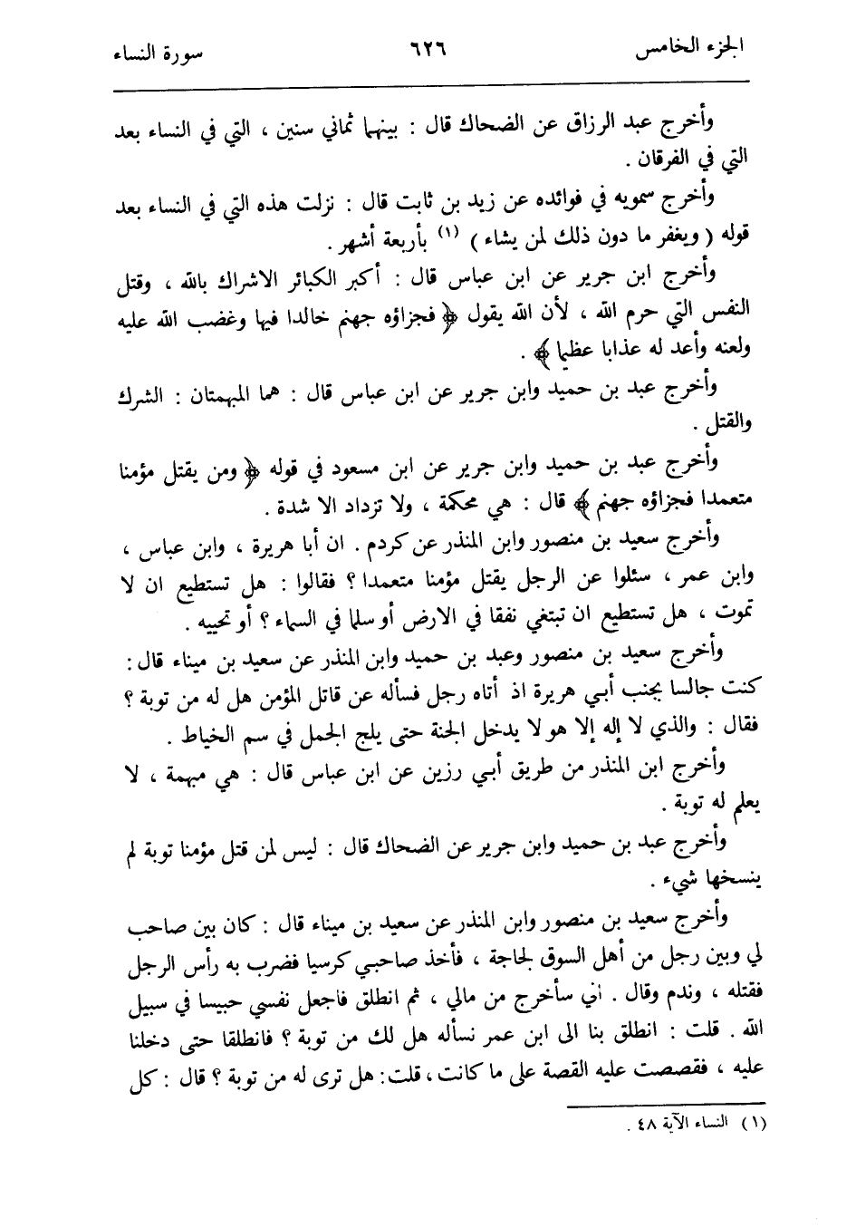 وَأخرج ابْن جرير عَن ابْن عَبَّاس قَالَ: أكبر الْكَبَائِر الْإِشْرَاك بِاللَّه وَقتل النَّفس الَّتِي حرم الله لِأَن الله يَقُول {فَجَزَاؤُهُ جَهَنَّم خَالِدا فِيهَا وَغَضب الله عَلَيْهِ ولعنه وَأعد لَهُ عذَابا عَظِيما}