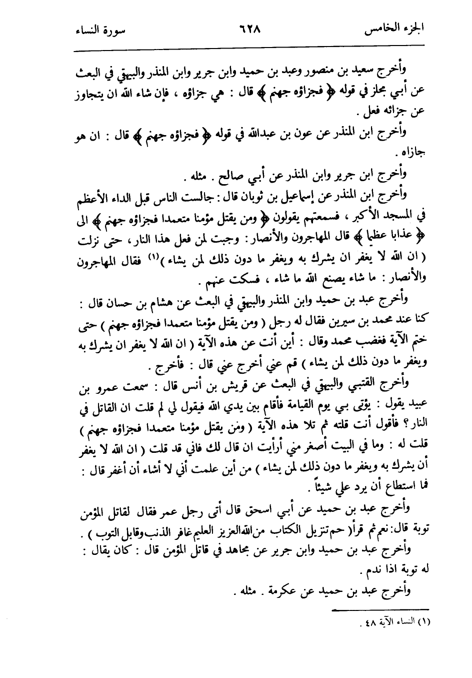 وَأخرج عبد بن حميد وَابْن الْمُنْذر وَالْبَيْهَقِيّ فِي الْبَعْث عَن هِشَام بن حسان قَالَ: كُنَّا عِنْد مُحَمَّد بن سِيرِين فَقَالَ لَهُ رجل (وَمن يقتل مُؤمنا مُتَعَمدا فَجَزَاؤُهُ جَهَنَّم) حَتَّى ختم الْآيَة فَغَضب مُحَمَّد وَقَالَ: أَيْن أَنْت عَن هَذِه الْآيَة (إِن الله لَا يغْفر أَن يُشْرك بِهِ وَيغْفر مَا دون ذَلِك لمن يَشَاء) قُم عني أخرج عني قَالَ: فَأخْرج