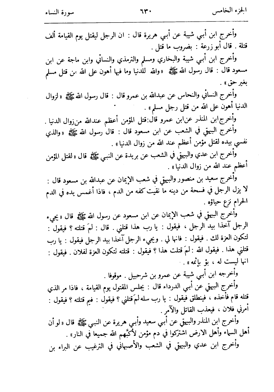 وَأخرج ابْن شيبَة وَالْبُخَارِيّ وَمُسلم وَالتِّرْمِذِيّ وَالنَّسَائِيّ وَابْن ماجة عَن ابْن مَسْعُود قَالَ: قَالَ رَسُول الله صلى الله عَلَيْهِ وَسلم: وَالله للدينا وَمَا فِيهَا أَهْون على الله من قتل مُسلم بِغَيْر حق