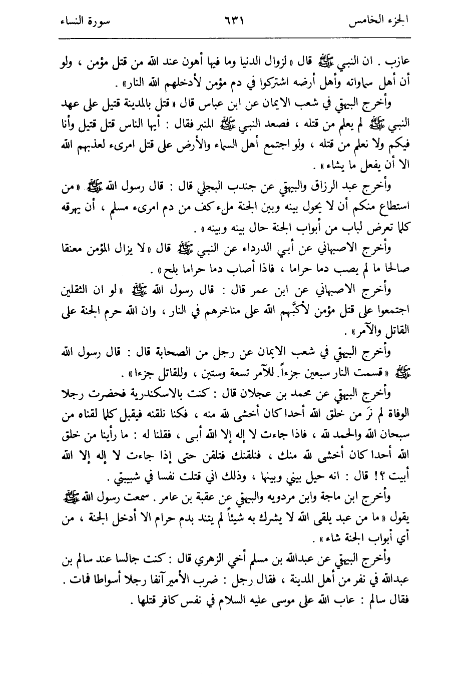 وَأخرج الْبَيْهَقِيّ فِي شعب الإِيمان عَن ابْن عَبَّاس قَالَ: قتل بِالْمَدِينَةِ قَتِيل على عهد النَّبِي صلى الله عَلَيْهِ وَسلم لم يعلم من قَتله فَصَعدَ النَّبِي صلى الله عَلَيْهِ وَسلم الْمِنْبَر فَقَالَ: أَيهَا النَّاس قتل قَتِيل وَأَنا فِيكُم وَلَا نعلم من قَتله وَلَو اجْتمع أهل السَّمَاء وَالْأَرْض على قتل امرىء لعذبهم الله إِلَّا أَن يفعل مَا يَشَاء