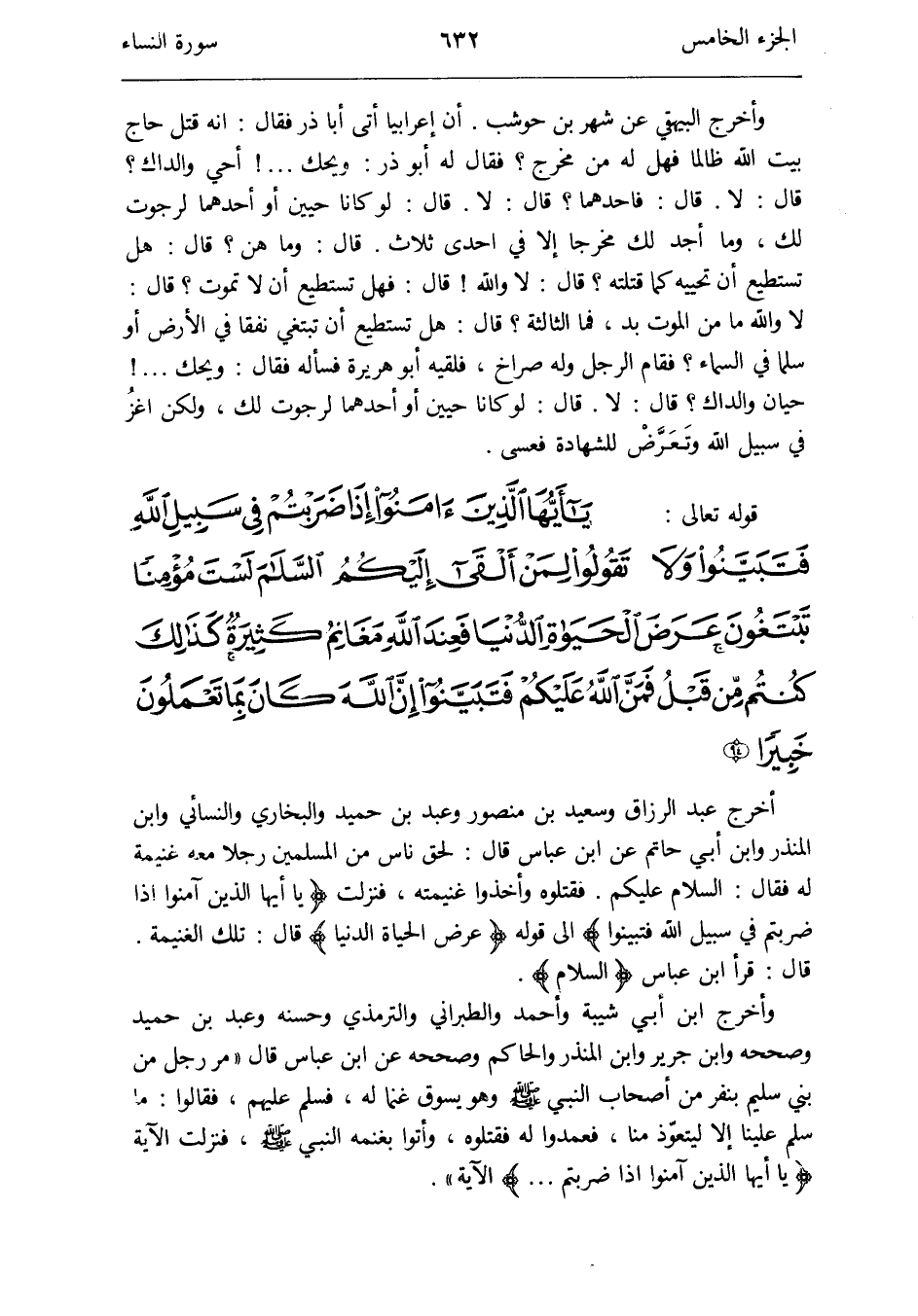 أخرج عبد الرَّزَّاق وَسَعِيد بن مَنْصُور وَعبد بن حميد وَالْبُخَارِيّ وَالنَّسَائِيّ وَابْن الْمُنْذر وَابْن أبي حَاتِم عَن ابْن عَبَّاس قَالَ: لحق نَاس من الْمُسلمين رجلا مَعَه غنيمَة لَهُ فَقَالَ: السَّلَام عَلَيْكُم