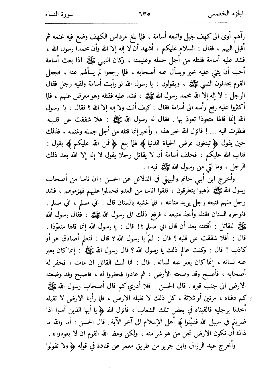 فَأنْزل الله خبر هَذَا وَأخْبر إِنَّمَا قَتله من أجل جمله وغنمه فَذَلِك حِين يَقُول {تَبْتَغُونَ عرض الْحَيَاة الدُّنْيَا} فَلَمَّا بلغ {فَمن الله عَلَيْكُم} يَقُول: فَتَابَ الله عَلَيْكُم فَحلف أُسَامَة أَن لَا يُقَاتل رجلا يَقُول لَا إِلَه إِلَّا الله بعد ذَلِك الرجل وَمَا لَقِي من رَسُول الله صلى الله عَلَيْهِ وَسلم فِيهِ