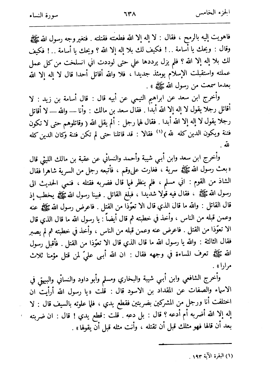 وَأخرج الشَّافِعِي وَابْن أبي شيبَة وَالْبُخَارِيّ وَمُسلم وَأَبُو دَاوُد وَالنَّسَائِيّ وَالْبَيْهَقِيّ فِي الْأَسْمَاء وَالصِّفَات عَن الْمِقْدَاد بن الْأسود قَالَ: قلت: يَا رَسُول الله أَرَأَيْت إِن اخْتلفت أَنا وَرجل من الْمُشْركين بضربتين فَقطع يَدي فَلَمَّا علوته بِالسَّيْفِ قَالَ: لَا إِلَه إِلَّا الله أضربه أم أَدَعهُ قَالَ: بل دَعه