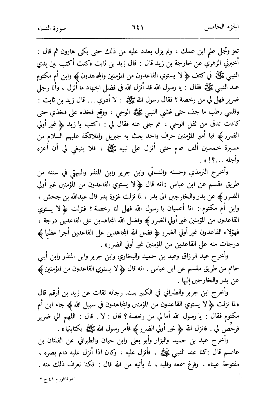 وَأخرج ابْن جرير وَالطَّبَرَانِيّ فِي الْكَبِير بِسَنَد رِجَاله ثِقَات عَن زيد بن أَرقم قَالَ: لما نزلت {لَا يَسْتَوِي الْقَاعِدُونَ من الْمُؤمنِينَ غير أولي الضَّرَر وَالْمُجَاهِدُونَ فِي سَبِيل الله} جَاءَ ابْن أم مَكْتُوم فَقَالَ: يَا رَسُول الله أما لي من رخصَة قَالَ: لَا