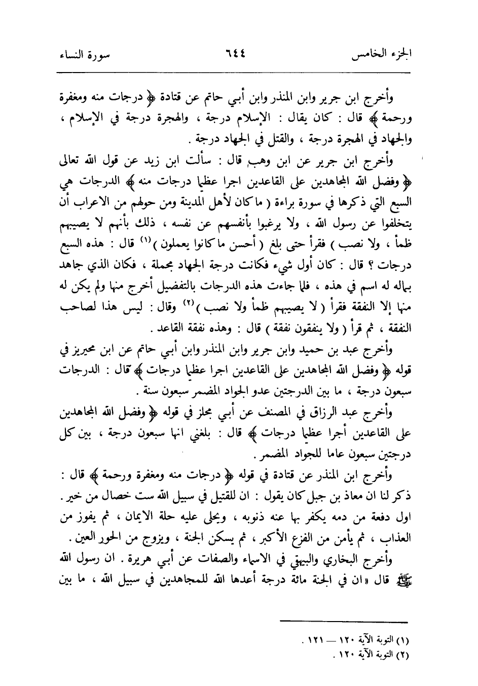 وَأخرج ابْن جرير عَن ابْن وهب قَالَ: سَأَلت ابْن زيد عَن قَول الله تَعَالَى {وَفضل الله الْمُجَاهدين على القاعدين أجرا عَظِيما دَرَجَات مِنْهُ} الدَّرَجَات هِيَ السَّبع لتي ذكرهَا فِي سُورَة بَرَاءَة (مَا كَانَ لأهل الْمَدِينَة وَمن حَولهمْ أَن يتخلفوا عَن رَسُول الله وَلَا يَرْغَبُوا بِأَنْفسِهِم عَن نَفسه ذَلِك بِأَنَّهُم لَا يصيبهم ظمأ وَلَا نصب) فَقَرَأَ حَتَّى بلغ (أحسن مَا كَانُوا يعْملُونَ) (التَّوْبَة الْآيَة 120 - 121) قَالَ: هَذِه السَّبع دَرَجَات قَالَ: كَانَ أول شَيْء فَكَانَت دَرَجَة الْجِهَاد مجملة فَكَانَ الَّذِي جَاهد بِمَالِه لَهُ اسْم فِي هَذِه فَلَمَّا جَاءَت هَذِه الدَّرَجَات بالتفضيل أخرج مِنْهَا وَلم يكن لَهُ مِنْهَا إِلَّا النَّفَقَة فَقَرَأَ (لَا يصيبهم ظمأ وَلَا نصب) (التَّوْبَة الْآيَة 120) وَقَالَ: لَيْسَ هَذَا لصَاحب النَّفَقَة ثمَّ قَرَأَ (وَلَا يُنْفقُونَ نَفَقَة) قَالَ: وَهَذِه نَفَقَة الْقَاعِد