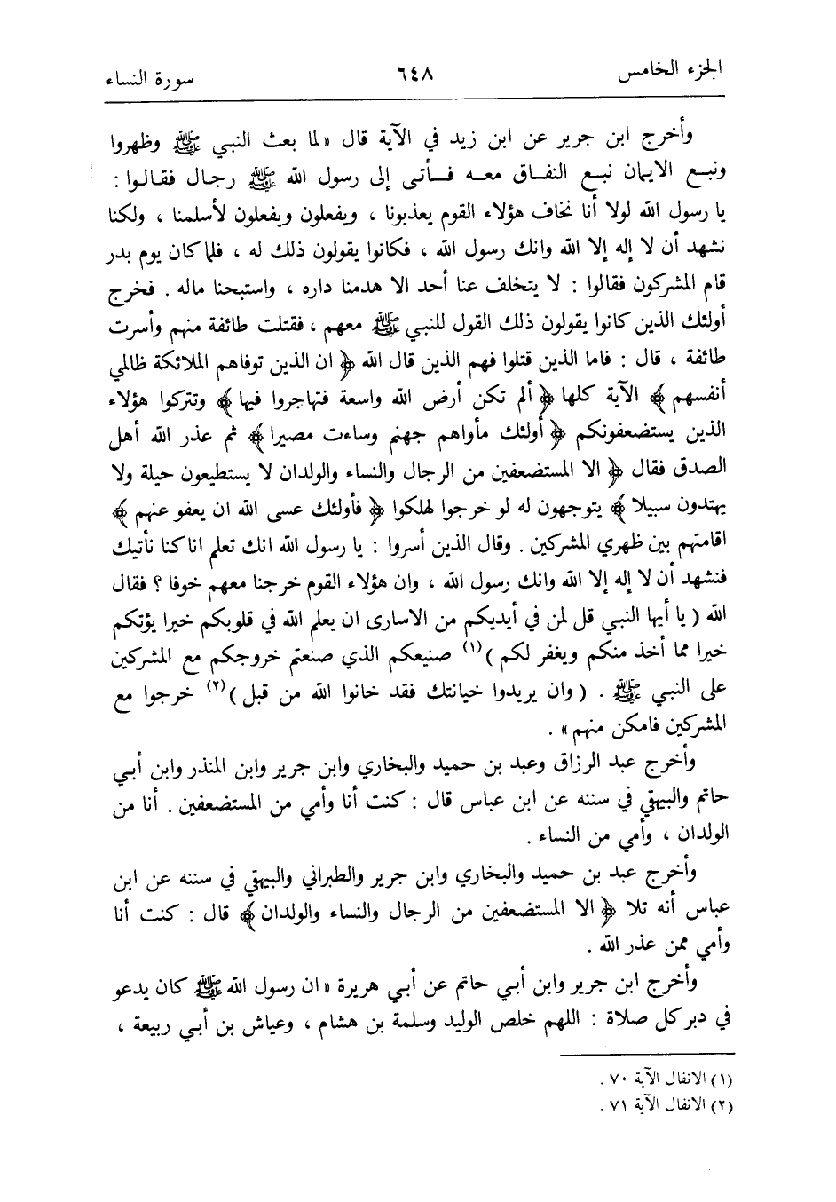 وَأخرج عبد الرَّزَّاق وَعبد بن حميد وَالْبُخَارِيّ وَابْن جرير وَابْن الْمُنْذر وَابْن أبي حَاتِم وَالْبَيْهَقِيّ فِي سنَنه عَن ابْن عَبَّاس قَالَ: كنت أَنا وَأمي من الْمُسْتَضْعَفِينَ