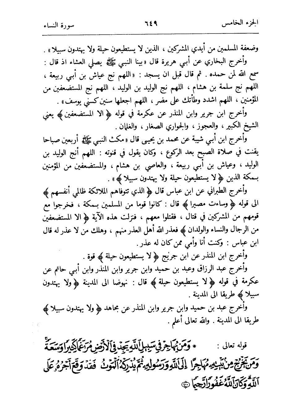 وَأخرج عبد الرَّزَّاق وَعبد بن حميد وَابْن جرير وَابْن الْمُنْذر وَابْن أبي حَاتِم عَن عِكْرِمَة فِي قَوْله {لَا يَسْتَطِيعُونَ حِيلَة} قَالَ: نهوضاً إِلَى الْمَدِينَة {وَلَا يَهْتَدُونَ سَبِيلا} طَرِيقا إِلَى الْمَدِينَة