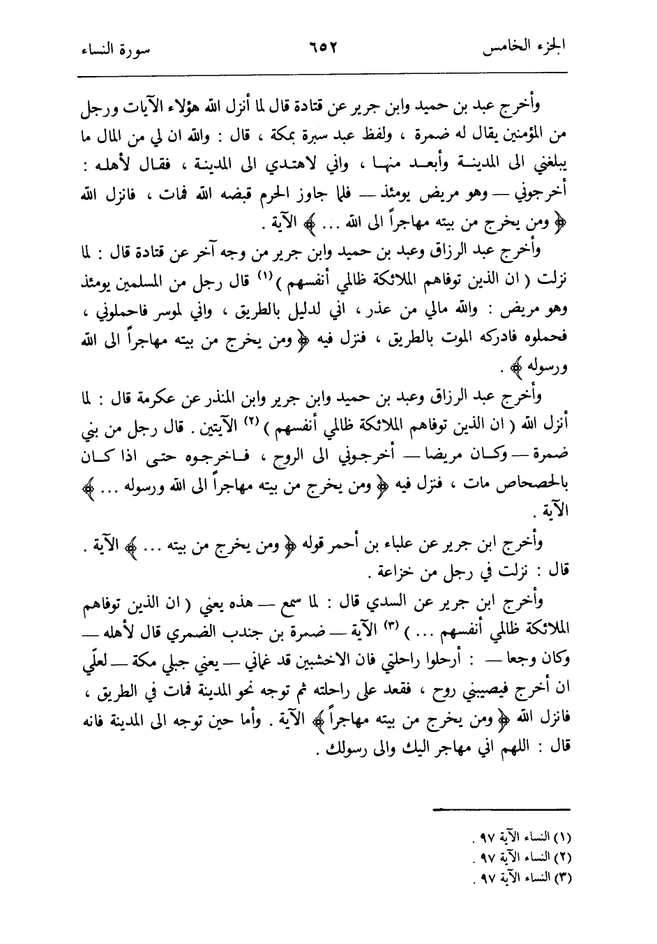 وَأخرج عبد الرَّزَّاق وَعبد بن حميد وَابْن جرير من وَجه آخر عَن قَتَادَة قَالَ: لما نزلت (إِن الَّذين تَوَفَّاهُم الْمَلَائِكَة ظالمي أنفسهم) (النِّسَاء الْآيَة 97) قَالَ رجل من الْمُسلمين يَوْمئِذٍ وهومريض: وَالله مَا لي من عذر إِنِّي لدَلِيل بِالطَّرِيقِ وَإِنِّي لموسر فاحملوني فَحَمَلُوهُ فأدركه الْمَوْت بِالطَّرِيقِ فَنزل فِيهِ {وَمن يخرج من بَيته مُهَاجرا إِلَى الله وَرَسُوله}