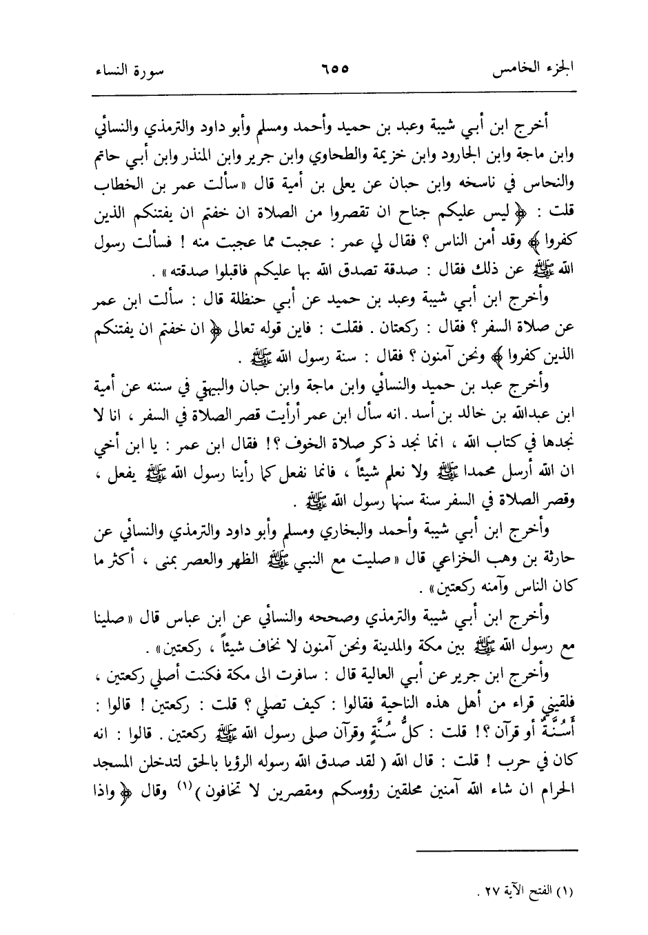 أخرج ابْن أبي شيبَة وَعبد بن حميد وَأحمد وَمُسلم وَأَبُو دَاوُد وَالتِّرْمِذِيّ وَالنَّسَائِيّ وَابْن ماجة وَابْن الْجَارُود وَابْن خُزَيْمَة والطَّحَاوِي وَابْن جرير وَابْن الْمُنْذر وَابْن أبي حَاتِم والنحاس فِي ناسخه وَابْن حبَان عَن يعلى بن أُميَّة قَالَ: سَأَلت عمر بن الْخطاب قلت: {فَلَيْسَ عَلَيْكُم جنَاح أَن تقصرُوا من الصَّلَاة إِن خِفْتُمْ أَن يَفْتِنكُم الَّذين كفرُوا} وَقد أَمن النَّاس فَقَالَ لي عمر: عجبت مِمَّا عجبت مِنْهُ فَسَأَلت رَسُول الله صلى الله عَلَيْهِ وَسلم عَن ذَلِك فَقَالَ: صَدَقَة تصدق الله بهَا عَلَيْكُم فاقبلوا صدقته