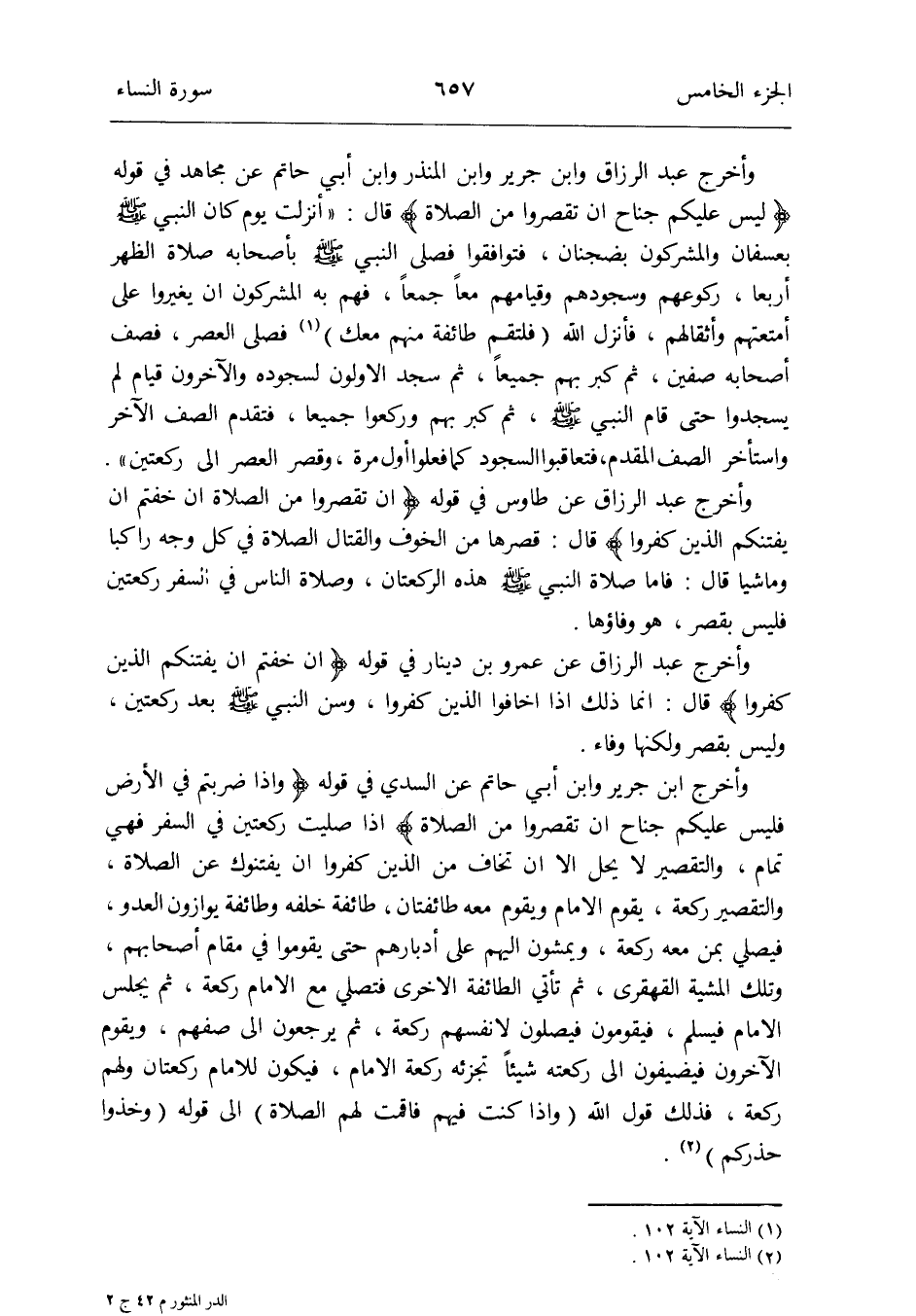 وَأخرج ابْن جرير وَابْن أبي حَاتِم عَن السّديّ فِي قَوْله {وَإِذا ضَرَبْتُمْ فِي الأَرْض فَلَيْسَ عَلَيْكُم جنَاح أَن تقصرُوا من الصَّلَاة} إِذا صليت رَكْعَتَيْنِ فِي السّفر فَهِيَ تَمام وَالتَّقْصِير لَا يحل إِلَّا أَن تخَاف من الَّذين كفرُوا أَن يفتنوك عَن الصَّلَاة وَالتَّقْصِير رَكْعَة يقوم الإِمَام وَيقوم مَعَه طَائِفَتَانِ طَائِفَة خَلفه وَطَائِفَة يوازون الْعَدو فَيصَلي بِمن مَعَه رَكْعَة ويمشون إِلَيْهِم على أدبارهم حَتَّى يقومُوا فِي مقَام أَصْحَابهم وَتلك المشية الْقَهْقَرَى ثمَّ تَأتي الطَّائِفَة الْأُخْرَى فَتُصَلِّي مَعَ الإِمَام رَكْعَة ثمَّ يجلس الإِمَام فَيسلم فَيقومُونَ فيصلون لأَنْفُسِهِمْ رَكْعَة ثمَّ يرجعُونَ إِلَى صفهم وَيقوم الْآخرُونَ فيضيفون إِلَى ركعته شَيْئا تُجزئه رَكْعَة الإِمَام فَيكون للْإِمَام رَكْعَتَانِ وَلَهُم رَكْعَة فَذَلِك قَول الله (وَإِذا كنت فيهم فأقمت لَهُم الصَّلَاة) إِلَى قَوْله (وخذوا حذركُمْ) (النِّسَاء الْآيَة 102)
