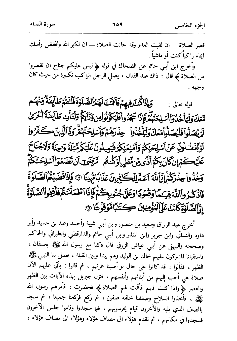 أخرج عبد الرَّزَّاق وَسَعِيد بن مَنْصُور وَابْن أبي شيبَة وَأحمد وَعبد بن حميد وَأَبُو دَاوُد وَالنَّسَائِيّ وَابْن جرير وَابْن الْمُنْذر وَابْن أبي حَاتِم وَالدَّارَقُطْنِيّ وَالطَّبَرَانِيّ وَالْحَاكِم وَصَححهُ وَالْبَيْهَقِيّ عَن أبي عَيَّاش الزرقي قَالَ: كُنَّا مَعَ رَسُول الله صلى الله عَلَيْهِ وَسلم بعسفان فَاسْتقْبلنَا الْمُشْركُونَ عَلَيْهِم خَالِد بن الْوَلِيد وهم بَيْننَا وَبَين الْقبْلَة فصلى بِنَا النَّبِي صلى الله عَلَيْهِ وَسلم الظّهْر فَقَالُوا: قد كَانُوا على حَال لَو أصبْنَا غرتهم ثمَّ قَالُوا: يَأْتِي عَلَيْهِم الْآن صَلَاة هِيَ أحب إِلَيْهِم من أبنائهم وأنفسهم فَنزل جِبْرِيل بِهَذِهِ الْآيَات بَين الظّهْر وَالْعصر {وَإِذا كنت فيهم فأقمت لَهُم الصَّلَاة} فَحَضَرت فَأَمرهمْ رَسُول الله صلى الله عَلَيْهِ وَسلم فَأخذُوا السِّلَاح وصففنا خَلفه صفّين ثمَّ ركع فَرَكَعْنَا جَمِيعًا ثمَّ سجد بالصف الَّذِي يَلِيهِ وَالْآخرُونَ قيام يَحْرُسُونَهُمْ فَلَمَّا سجدوا وَقَامُوا جلس الْآخرُونَ فسجدوا فِي مكانهم ثمَّ تقدم هَؤُلَاءِ إِلَى مصَاف هَؤُلَاءِ وَهَؤُلَاء إِلَى مصَاف هَؤُلَاءِ