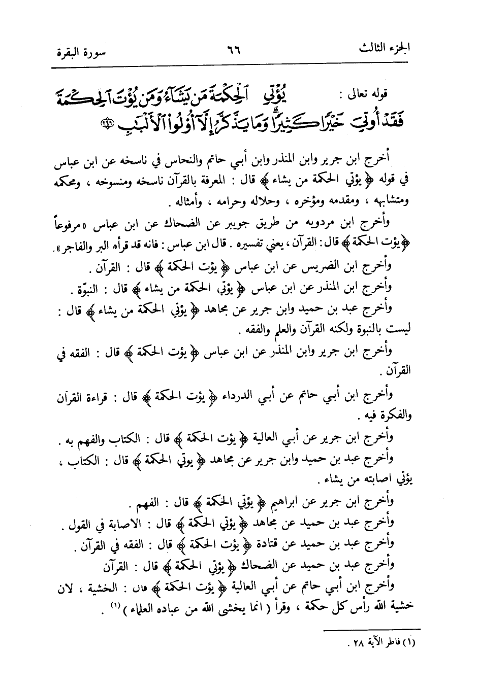 وَأخرج ابْن جرير وَابْن الْمُنْذر عَن ابْن عَبَّاس {يُؤْت الْحِكْمَة} قَالَ: الْفِقْه فِي الْقُرْآن