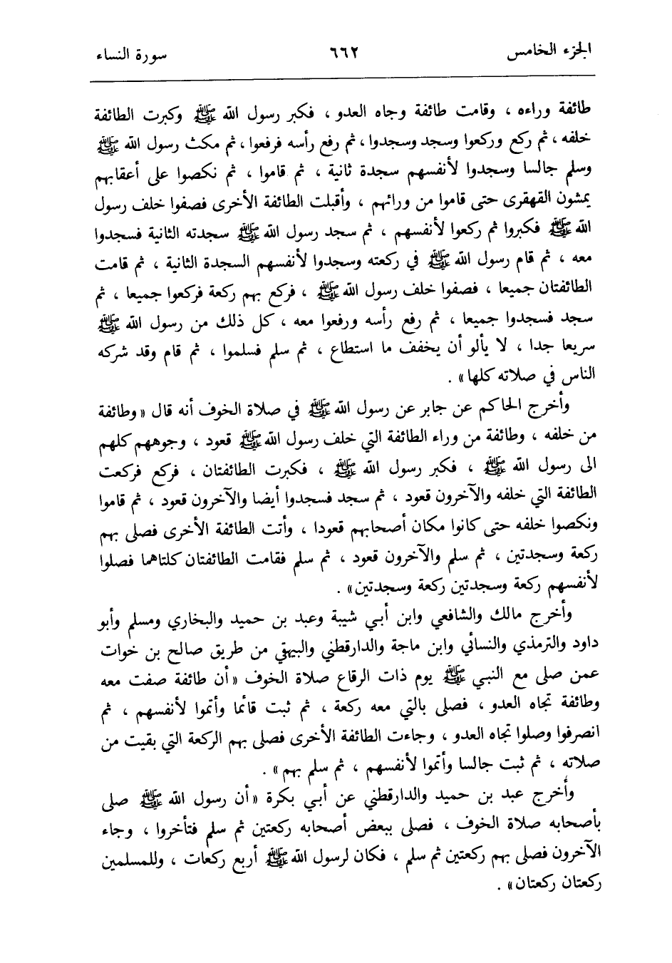 طَائِفَة وَرَاءه وَقَامَت طَائِفَة وجاه الْعَدو فَكبر رَسُول الله صلى الله عَلَيْهِ وَسلم وَكَبرت الطَّائِفَة خَلفه ثمَّ ركع وركعوا وَسجد وسجدوا ثمَّ رفع رَأسه فَرفعُوا ثمَّ مكث رَسُول الله صلى الله عَلَيْهِ وَسلم جَالِسا وسجدوا لأَنْفُسِهِمْ سَجْدَة ثَانِيَة ثمَّ قَامُوا ثمَّ نكصوا على أَعْقَابهم يَمْشُونَ الْقَهْقَرَى حَتَّى قَامُوا من ورائهم وَأَقْبَلت الطَّائِفَة الْأُخْرَى فصفوا خلف رَسُول الله صلى الله عَلَيْهِ وَسلم فكبروا ثمَّ ركعوا لأَنْفُسِهِمْ ثمَّ سجد رَسُول الله صلى الله عَلَيْهِ وَسلم سجدته الثَّانِيَة فسجدوا مَعَه ثمَّ قَامَ رَسُول الله صلى الله عَلَيْهِ وَسلم فِي ركعته وسجدوا لأَنْفُسِهِمْ السَّجْدَة الثَّانِيَة ثمَّ قَامَت الطائفتان جَمِيعًا فصفوا خلف رَسُول الله صلى الله عَلَيْهِ وَسلم فَرَكَعَ بهم رَكْعَة فركعوا جَمِيعًا ثمَّ سجد فسجدوا جَمِيعًا ثمَّ رفع رَأسه وَرفعُوا مَعَه كل ذَلِك من رَسُول الله صلى الله عَلَيْهِ وَسلم سَرِيعا جدا لَا يألو أَن يُخَفف مَا اسْتَطَاعَ ثمَّ سلم فَسَلمُوا ثمَّ قَامَ وَقد شركه النَّاس فِي صلَاته كلهَا