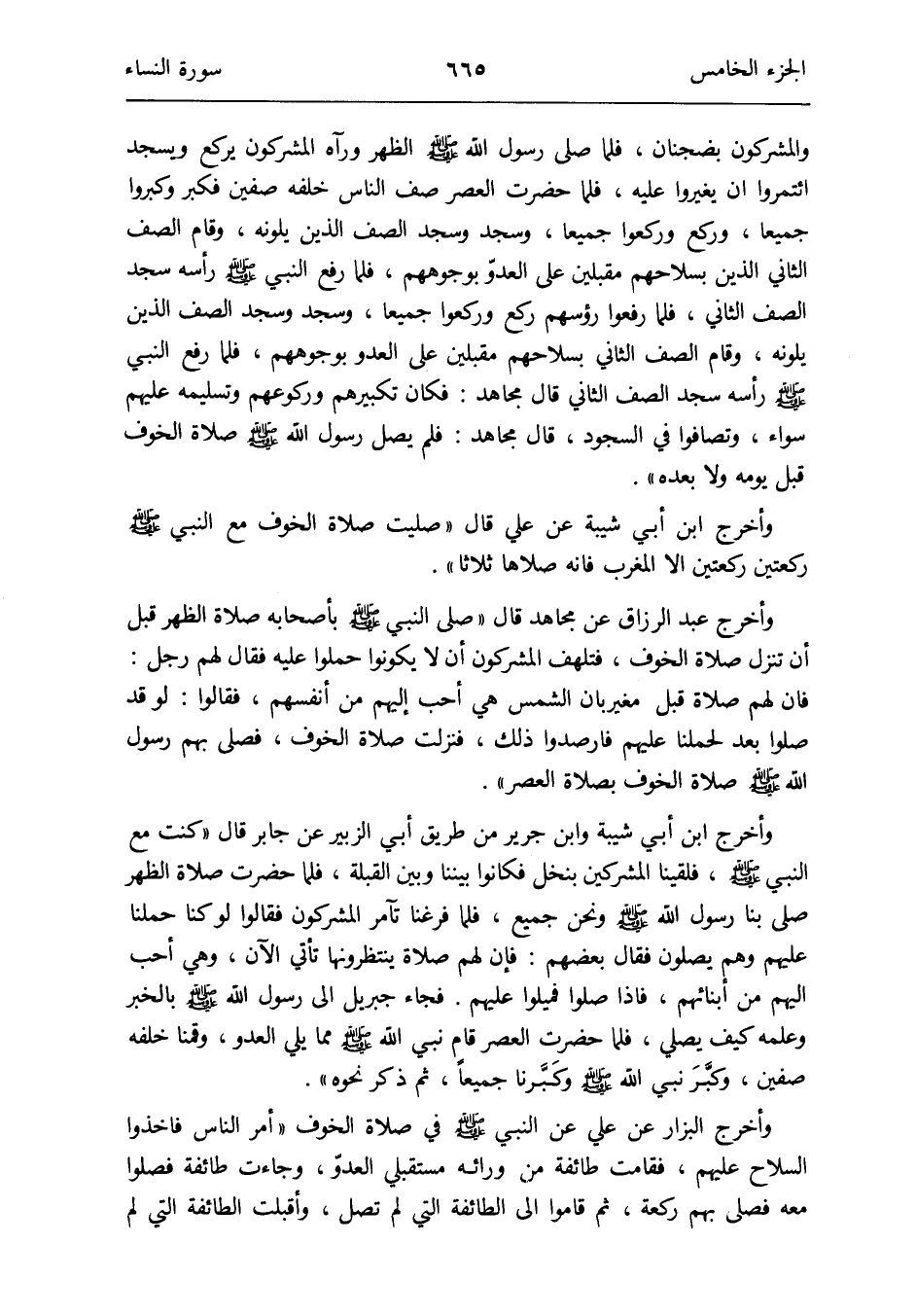 وَأخرج ابْن أبي شيبَة وَابْن جرير من طَرِيق أبي الزبير عَن جَابر قَالَ: كنت مَعَ النَّبِي صلى الله عَلَيْهِ وَسلم فلقينا الْمُشْركين بِنَخْل فَكَانُوا بَيْننَا وَبَين الْقبْلَة فَلَمَّا حضرت صَلَاة الظّهْر صلى بِنَا رَسُول الله صلى الله عَلَيْهِ وَسلم وَنحن جَمِيع فَلَمَّا فَرغْنَا تآمر الْمُشْركُونَ فَقَالُوا لَو كُنَّا حملنَا عَلَيْهِم وهم يصلونَ فَقَالَ بَعضهم: فَإِن لَهُم صَلَاة ينتظرونها تَأتي الْآن وَهِي أحب إِلَيْهِم من أَبْنَاءَهُم فَإِذا صلوا فَمِيلُوا عَلَيْهِم