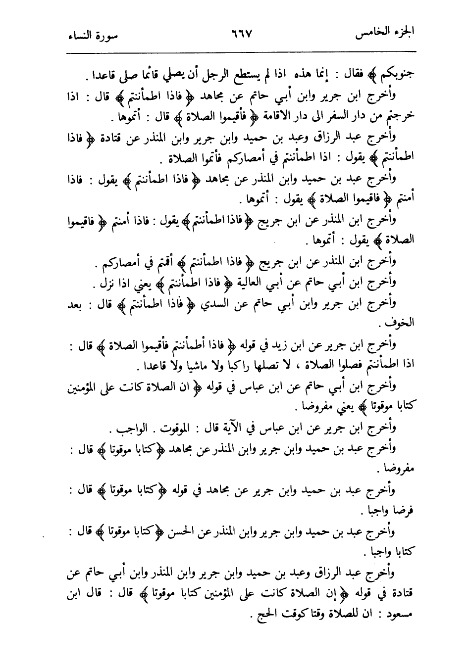 وَأخرج ابْن جرير عَن ابْن زيد فِي قَوْله {فَإِذا اطمأننتم فأقيموا الصَّلَاة} قَالَ: إِذا اطمأننتم فصلوا الصَّلَاة لَا تصلها رَاكِبًا وَلَا مَاشِيا وَلَا قَاعِدا