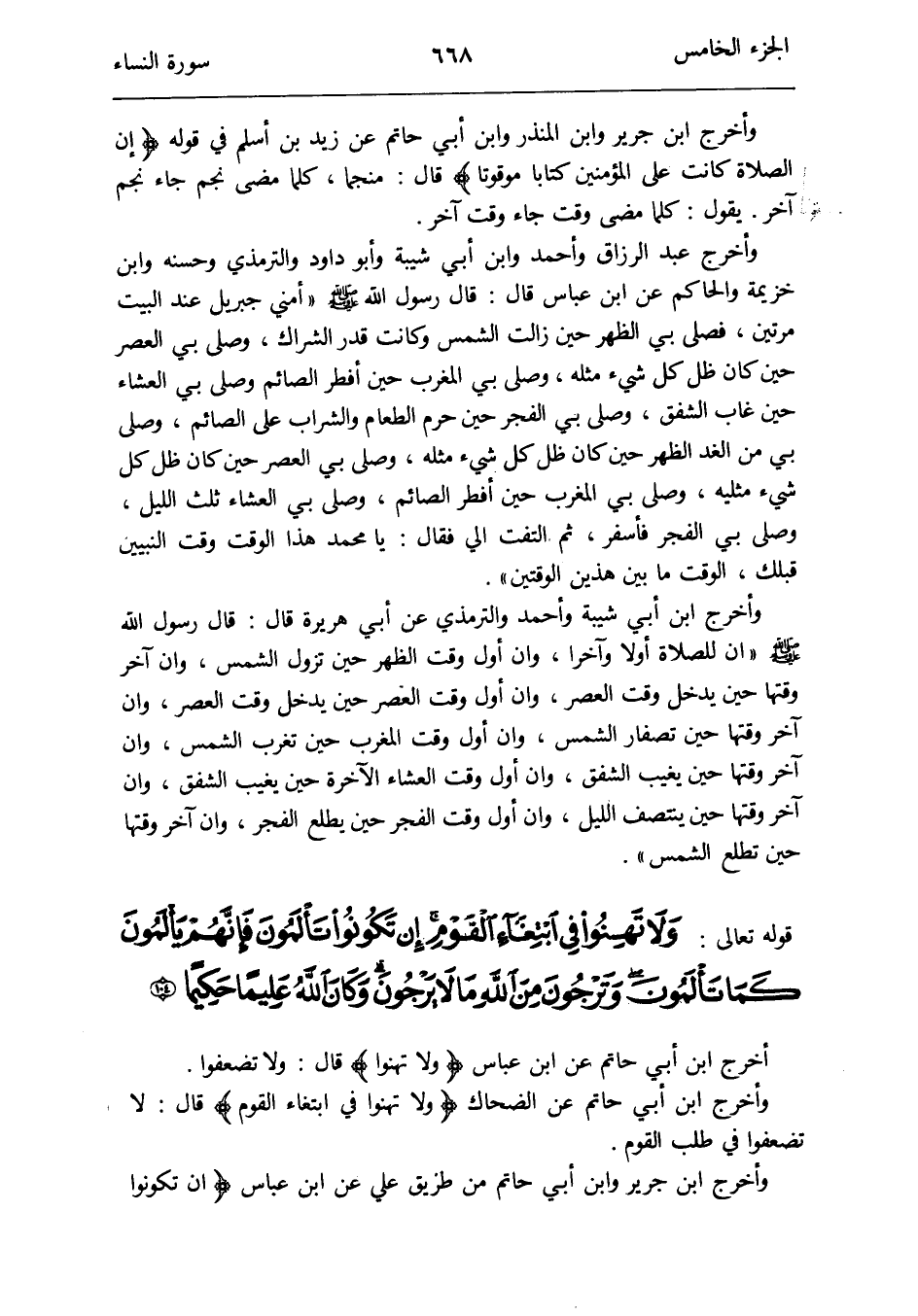 وَأخرج ابْن جرير وَابْن الْمُنْذر وَابْن أبي حَاتِم عَن زيد بن أسلم فِي قَوْله {إِن الصَّلَاة كَانَت على الْمُؤمنِينَ كتابا موقوتاً} قَالَ: منجماً كلما مضى نجم جَاءَ نجم آخر