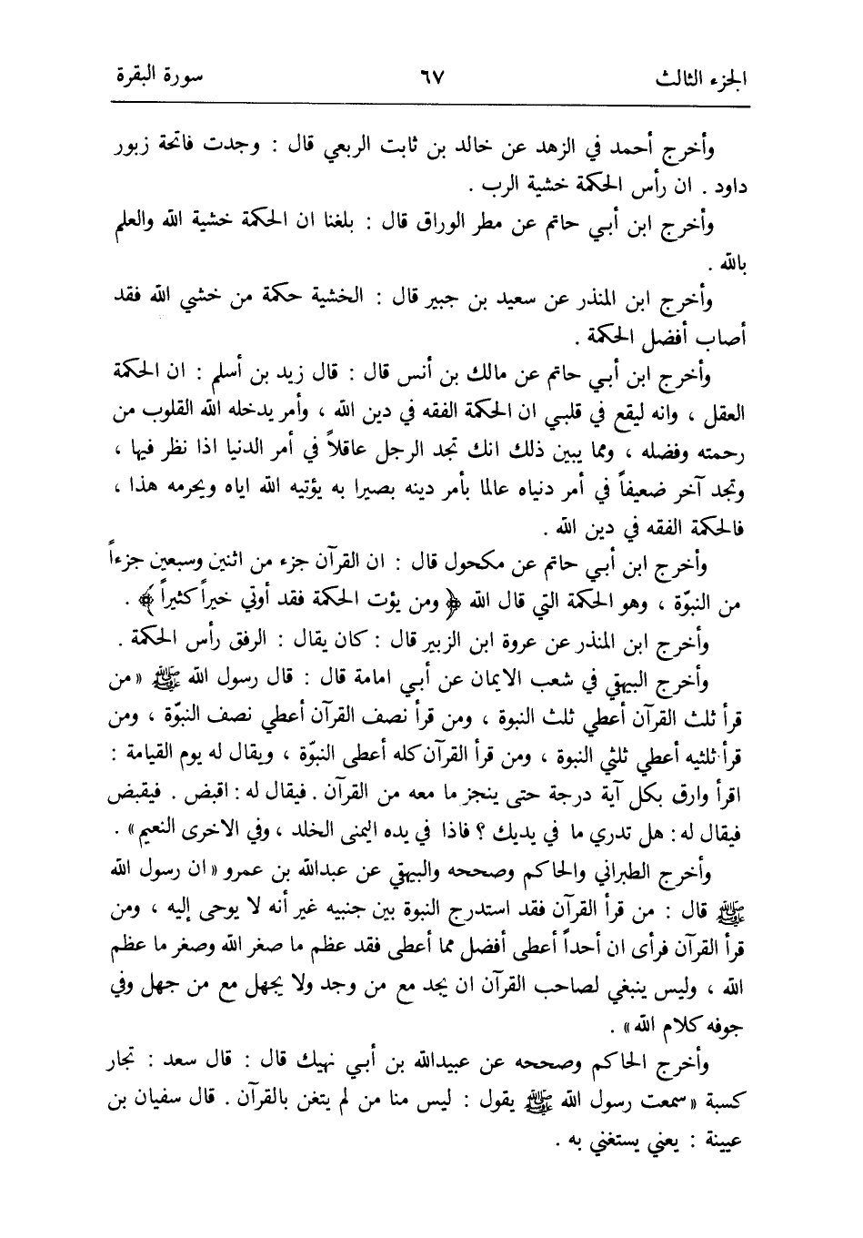 وَأخرج ابْن أبي حَاتِم عَن مَالك بن أنس قَالَ: قَالَ زيد بن أسلم: إِن الْحِكْمَة الْعقل وانه ليَقَع فِي قلبِي ان الْحِكْمَة الْفِقْه فِي دين الله وَأمر يدْخلهُ الله الْقُلُوب من رَحمته وفضله وَمِمَّا يبين ذَلِك أَنَّك تَجِد الرجل عَاقِلا فِي أَمر الدُّنْيَا إِذا نظر فِيهَا وتجد آخر ضَعِيفا فِي أَمر دُنْيَاهُ عَالما بِأَمْر دينه بَصيرًا بِهِ يؤتيه الله إِيَّاه ويحرمه هَذَا فالحكمة الْفِقْه فِي دين الله