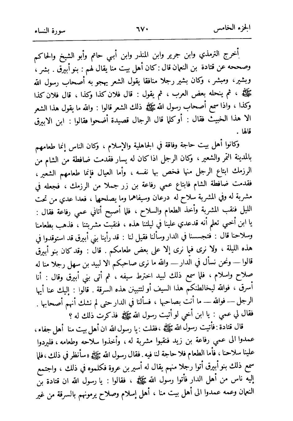 فَقَالَ رَسُول الله صلى الله عَلَيْهِ وَسلم: سَأَنْظُرُ فِي ذَلِك فَلَمَّا سمع ذَلِك بَنو أُبَيْرِق أَتَوا رجلا مِنْهُم يُقَال لَهُ أَسِير بن عُرْوَة فكلموه فِي ذَلِك وَاجْتمعَ إِلَيْهِ نَاس من أهل الدَّار فَأتوا رَسُول الله صلى الله عَلَيْهِ وَسلم فَقَالُوا: يَا رَسُول الله إِن قَتَادَة بن النُّعْمَان وَعَمه عَمدُوا إِلَى أهل بَيت منا أهل إِسْلَام وَصَلَاح يرمونهم بِالسَّرقَةِ من غير