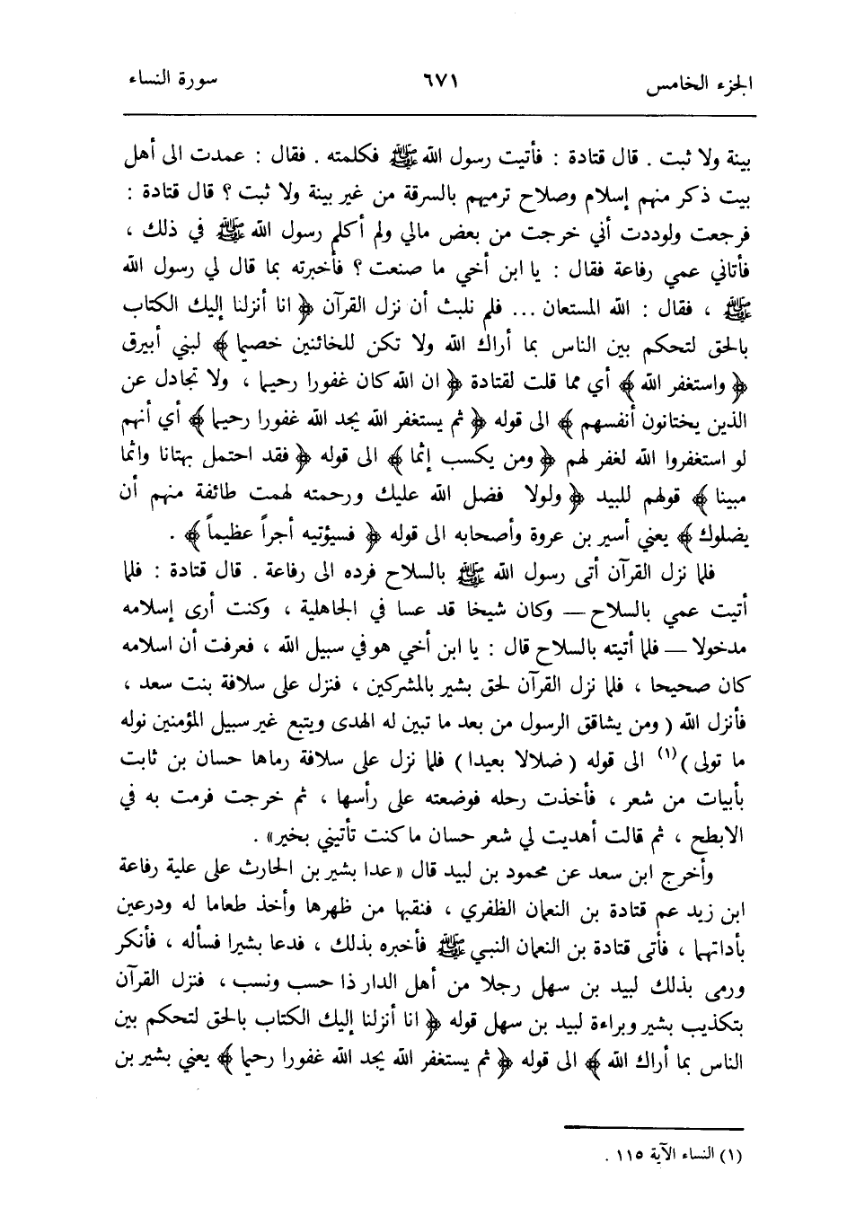 فَلم نَلْبَث أَن نزل الْقُرْآن {إِنَّا أنزلنَا إِلَيْك الْكتاب بِالْحَقِّ لتَحكم بَين النَّاس بِمَا أَرَاك الله وَلَا تكن للخائنين خصيماً} لبني أُبَيْرِق {واستغفر الله} أَي مِمَّا قلت لِقَتَادَة {إِن الله كَانَ غَفُورًا رحِيما وَلَا تجَادل عَن الَّذين يَخْتَانُونَ أنفسهم} إِلَى قَوْله {ثمَّ يسْتَغْفر الله يجد الله غَفُورًا رحِيما} أَي أَنهم لَو اسْتَغْفرُوا الله لغفر لَهُم {وَمن يكْسب إِثْمًا} إِلَى قَوْله {فقد احْتمل بهتاناً وإثماً مُبينًا} قَوْلهم للبيد {وَلَوْلَا فضل الله عَلَيْك وَرَحمته لهمت طَائِفَة مِنْهُم أَن يضلوك} يَعْنِي أَسِير بن عُرْوَة وَأَصْحَابه إِلَى قَوْله {فسيؤتيه أجرا عَظِيما}