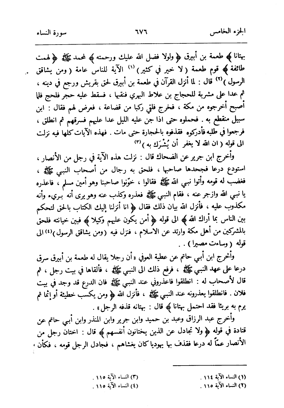 طعمة بن أُبَيْرِق {وَلَوْلَا فضل الله عَلَيْك وَرَحمته} لمُحَمد صلى الله عَلَيْهِ وَسلم {لهمت طَائِفَة} قوم طعمة (لَا خير فِي كثير) (النِّسَاء الْآيَة 114) الْآيَة للنَّاس عَامَّة (وَمن يُشَاقق الرَّسُول) (النِّسَاء الْآيَة 115) قَالَ: لما أنزل الْقُرْآن فِي طعمة بن أُبَيْرِق لحق بِقُرَيْش وَرجع فِي دينه ثمَّ عدا على مشربَة للحجاج بن علاط البهري فنقبها فَسقط عَلَيْهِ حجر فلحج فَلَمَّا أصبح أَخْرجُوهُ من مَكَّة فَخرج فلقي ركباً من قضاعة فَعرض لَهُم فَقَالَ: ابْن سَبِيل مُنْقَطع بِهِ