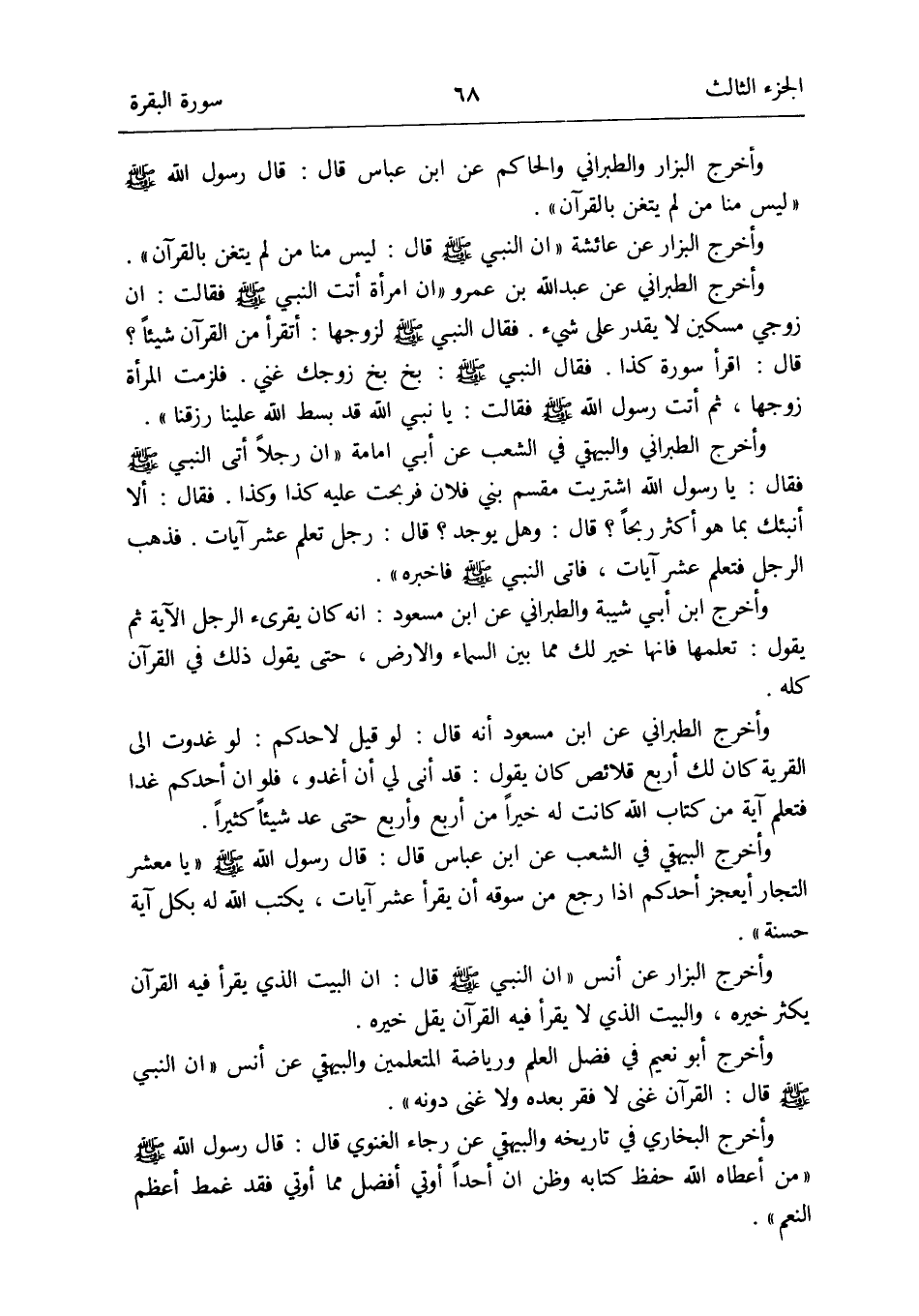 وَأخرج الْبَزَّار عَن أنس أَن النَّبِي صلى الله عَلَيْهِ وَسلم قَالَ: إِن الْبَيْت الَّذِي يقْرَأ فِيهِ الْقُرْآن يكثر خَيره وَالْبَيْت الَّذِي لَا يقْرَأ فِيهِ الْقُرْآن يقل خَيره