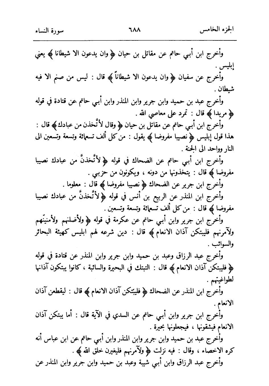 وَأخرج ابْن جرير وَابْن أبي حَاتِم عَن عِكْرِمَة فِي قَوْله {ولأضلنهم ولأمنينّهم ولآمرنهم فليبتكن آذان الْأَنْعَام} قَالَ: دين شَرعه لَهُم إِبْلِيس كَهَيئَةِ البحائر والسوائب