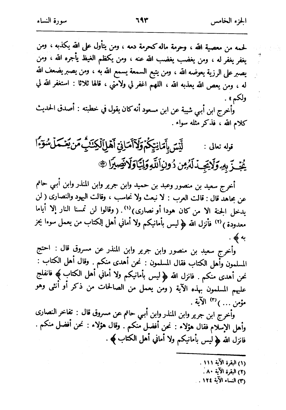 وَقَالُوا (لن تمسنا النَّار إِلَّا أَيَّامًا معدوة) (الْبَقَرَة الْآيَة 80) فَأنْزل الله {لَيْسَ بأمانيكم وَلَا أماني أهل الْكتاب من يعْمل سوءا يجز بِهِ}