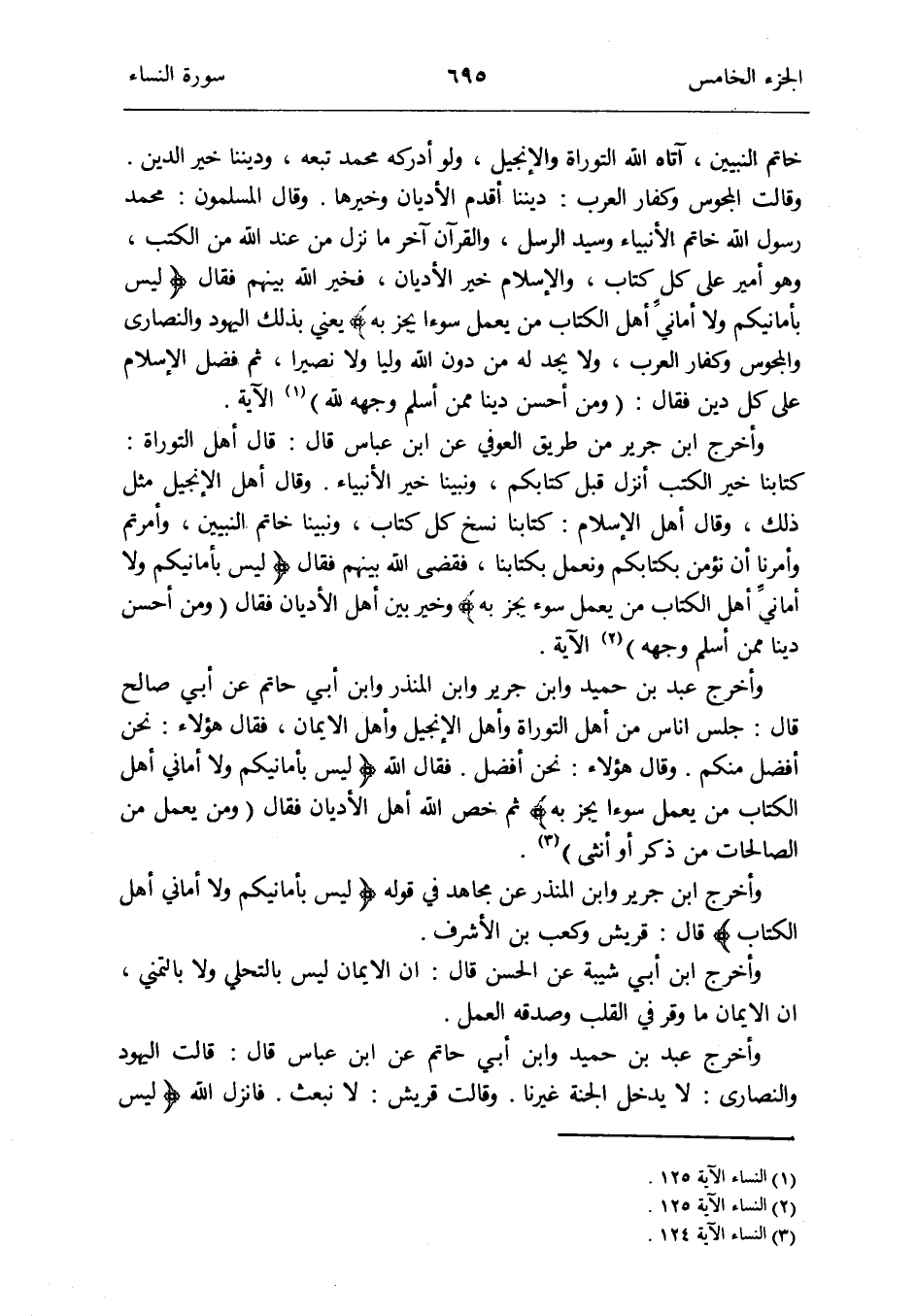 وَقَالَ الْمُسلمُونَ: مُحَمَّد رَسُول الله وَخَاتم الْأَنْبِيَاء وَسيد الرُّسُل وَالْقُرْآن آخر مَا نزل من عِنْد الله من الْكتب وَهُوَ أَمِير على كل كتاب وَالْإِسْلَام خير الْأَدْيَان فَخير الله بَينهم فَقَالَ {لَيْسَ بأمانيكم وَلَا أماني أهل الْكتاب من يعْمل سوءا يجز بِهِ} يَعْنِي بذلك الْيَهُود وَالنَّصَارَى وَالْمَجُوس وكفار الْعَرَب وَلَا يجد لَهُ من دون الله وليا وَلَا نَصِيرًا ثمَّ فضل الْإِسْلَام على كل دين فَقَالَ: (وَمن أحسن دينا مِمَّن أسلم وَجهه لله) (النِّسَاء الْآيَة 125) الْآيَة