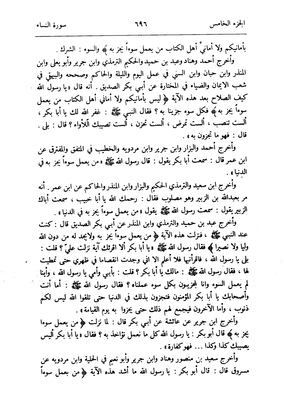 وَأخرج عبد بن حميد وَالتِّرْمِذِيّ وَابْن الْمُنْذر عَن أبي بكر الصّديق قَالَ: كنت عِنْد النَّبِي صلى الله عَلَيْهِ وَسلم فَنزلت هَذِه الْآيَة {من يعْمل سوءا يجز بِهِ وَلَا يجد لَهُ من دون الله وليا وَلَا نَصِيرًا} فَقَالَ رَسُول الله صلى الله عَلَيْهِ وَسلم: يَا أَبَا بكر أَلا أقرئك آيَة نزلت عليّ قلت: بلَى يَا رَسُول الله فاقرأنيها فَلَا أعلم إِلَّا أَنِّي وجدت انقصاما فِي ظَهْري حَتَّى تمطيت لَهَا فَقَالَ رَسُول الله صلى الله عَلَيْهِ وَسلم: مَالك يَا أَبَا بكر قلت: بِأبي وَأمي يَا رَسُول الله وأينا لم يعْمل السوء وَإِنَّا لمجزيون بِكُل سوء عَمِلْنَاهُ فَقَالَ رَسُول الله صلى الله عَلَيْهِ وَسلم: أما أَنْت وَأَصْحَابك يَا أَبَا بكر الْمُؤْمِنُونَ فتجزون بذلك فِي الدِّينَا حَتَّى تلقوا الله لَيْسَ لكم ذنُوب وَأما الْآخرُونَ فَيجمع لَهُم ذَلِك حَتَّى يجزوا بِهِ يَوْم الْقِيَامَة
