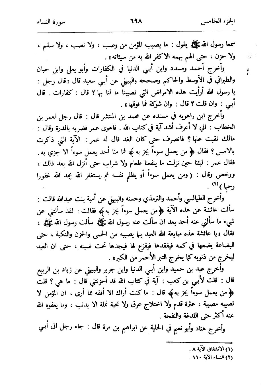 وَأخرج الطَّيَالِسِيّ وَأحمد وَالتِّرْمِذِيّ وَحسنه وَالْبَيْهَقِيّ عَن أُميَّة بنت عبد الله قَالَت: سَأَلت عَائِشَة عَن هَذِه الْآيَة {من يعْمل سوءا يجز بِهِ} فَقَالَت: لقد سَأَلتنِي عَن شَيْء مَا سَأَلَني عَنهُ أحد بعد أَن سَأَلت عَنهُ رَسُول الله صلى الله عَلَيْهِ وَسلم سَأَلت رَسُول الله صلى الله عَلَيْهِ وَسلم فَقَالَ: يَا عَائِشَة هَذِه مبايعة الله العَبْد بِمَا يُصِيبهُ من الْحمى والحزن والنكبة حَتَّى البضاعة يَضَعهَا فِي كمه فيفقدها فَيفزع لَهَا فيجدها تَحت ضبنه حَتَّى إِن العَبْد ليخرج من ذنُوبه كَمَا يخرج التبر الْأَحْمَر من الْكِير