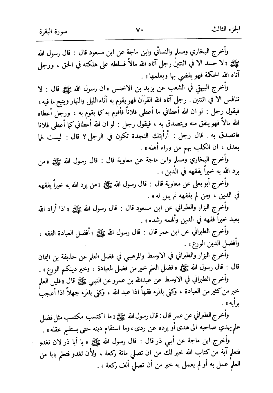 وَأخرج البُخَارِيّ وَمُسلم وَالنَّسَائِيّ وَابْن ماجة عَن ابْن مَسْعُود قَالَ: قَالَ رَسُول الله صلى الله عَلَيْهِ وَسلم: لَا حسد إِلَّا فِي اثْنَتَيْنِ رجل آتَاهُ الله مَالا فَسَلَّطَهُ على هَلَكته فِي الْحق وَرجل آتَاهُ الله الْحِكْمَة فَهُوَ يقْضِي بهَا وَيعلمهَا