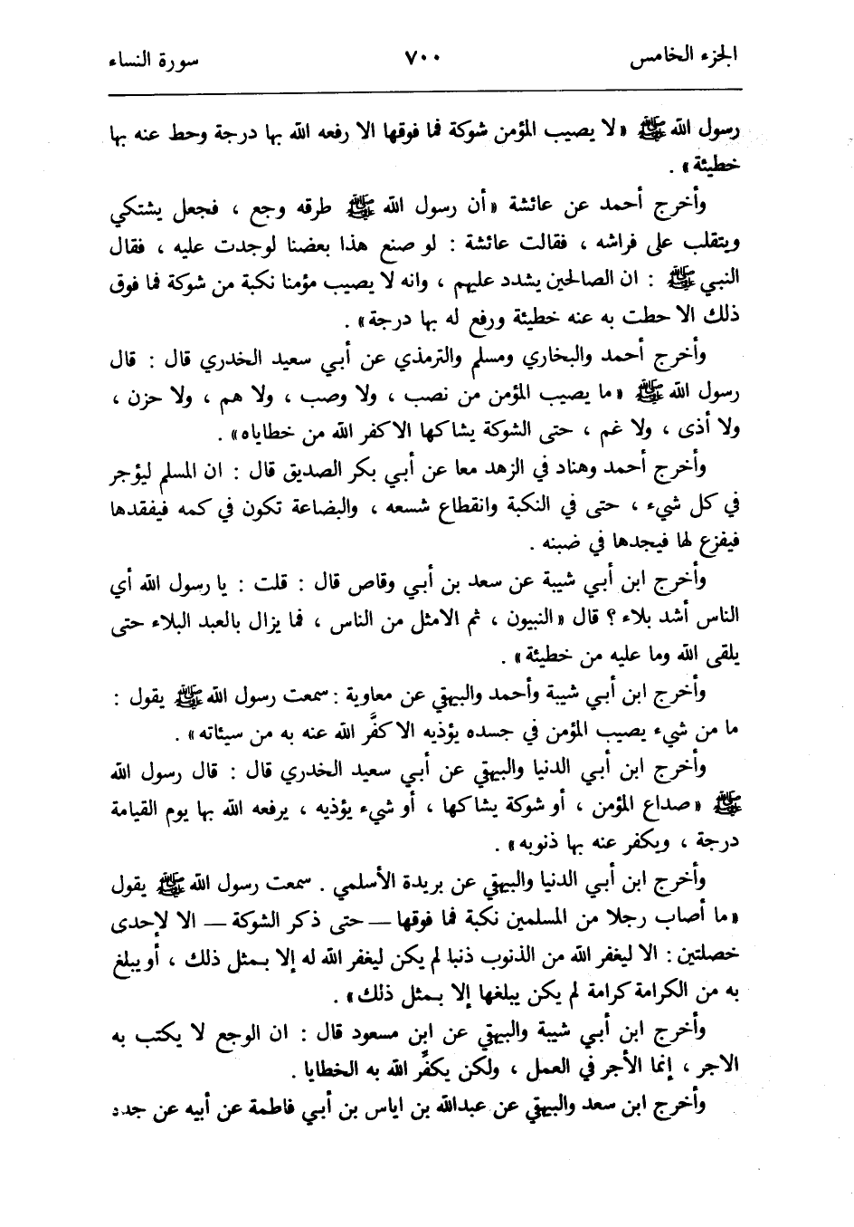 وَأخرج أَحْمد وَالْبُخَارِيّ وَمُسلم وَالتِّرْمِذِيّ عَن أبي سعيد الْخُدْرِيّ قَالَ: قَالَ رَسُول الله صلى الله عَلَيْهِ وَسلم: مَا يُصِيب الْمُؤمن من نصب وَلَا وصب وَلَا هم وَلَا حزن وَلَا أَذَى وَلَا غم حَتَّى الشَّوْكَة يشاكها إِلَّا كفر الله من خطاياه