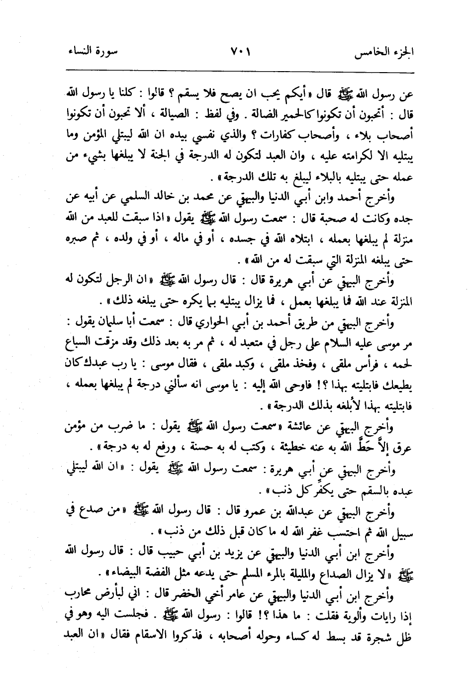 وَفِي لفظ: الصيالة أَلا تحبون أَن تَكُونُوا أَصْحَاب بلَاء وَأَصْحَاب كَفَّارَات وَالَّذِي نَفسِي بِيَدِهِ إِن الله ليبتلي الْمُؤمن وَمَا يَبْتَلِيه إِلَّا لكرامته عَلَيْهِ وَإِن العَبْد لتَكون لَهُ الدرجَة فِي الْجنَّة لَا يبلغهَا بِشَيْء من عمله حَتَّى يَبْتَلِيه بالبلاء ليبلغ بِهِ تِلْكَ الدرجَة